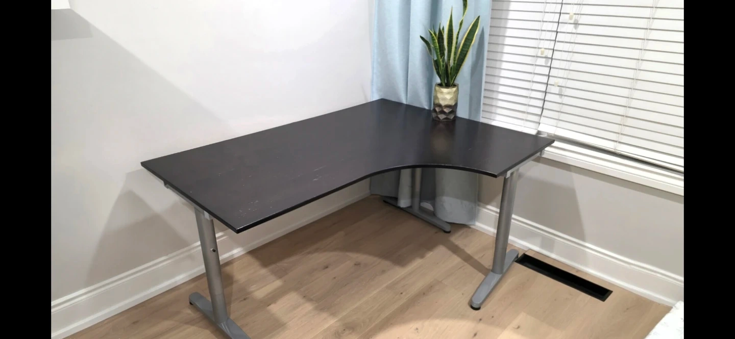 Selling a dark brown corner desk. Some wear and tear on the top. would be great for a home office or student. sturdy desk with a metal frame on the bottom