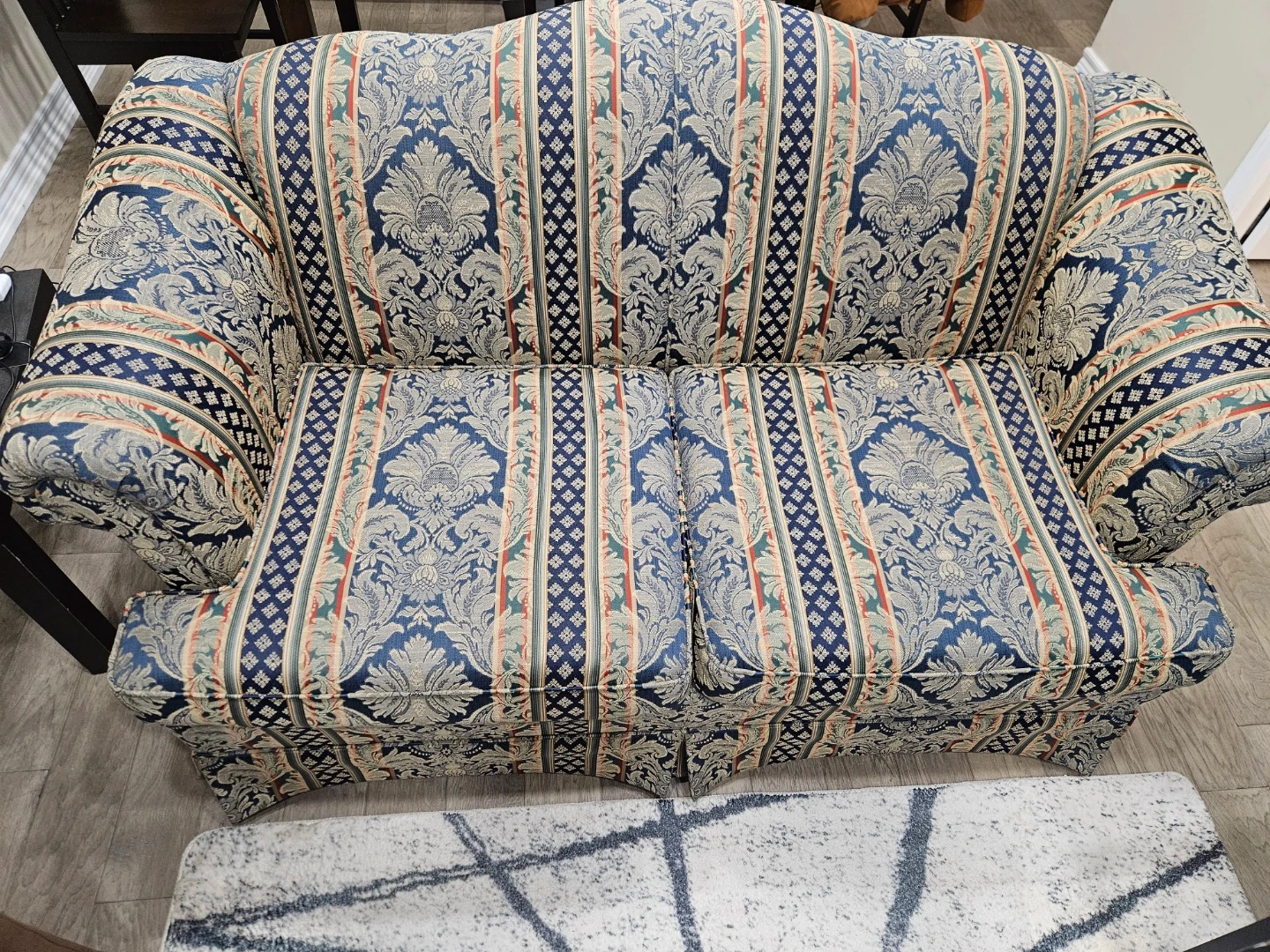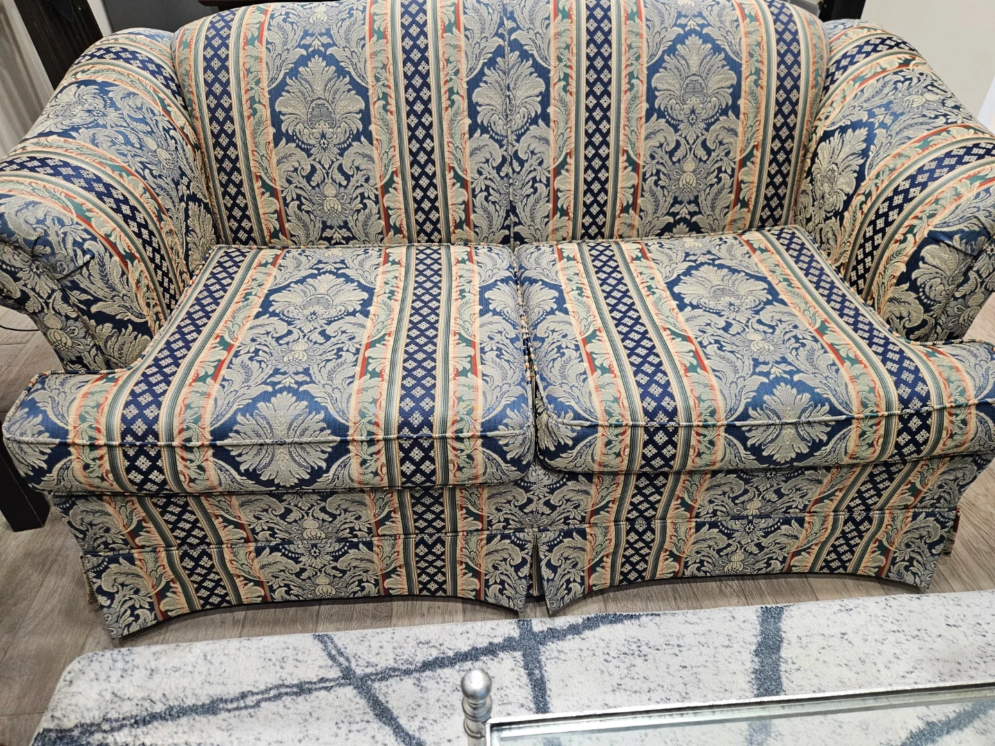 This is a patterned loveseat sofa with a traditional floral and stripe design. It features a blue, beige, and red colour palette. Its compact size makes it suitable for smaller living spaces.
