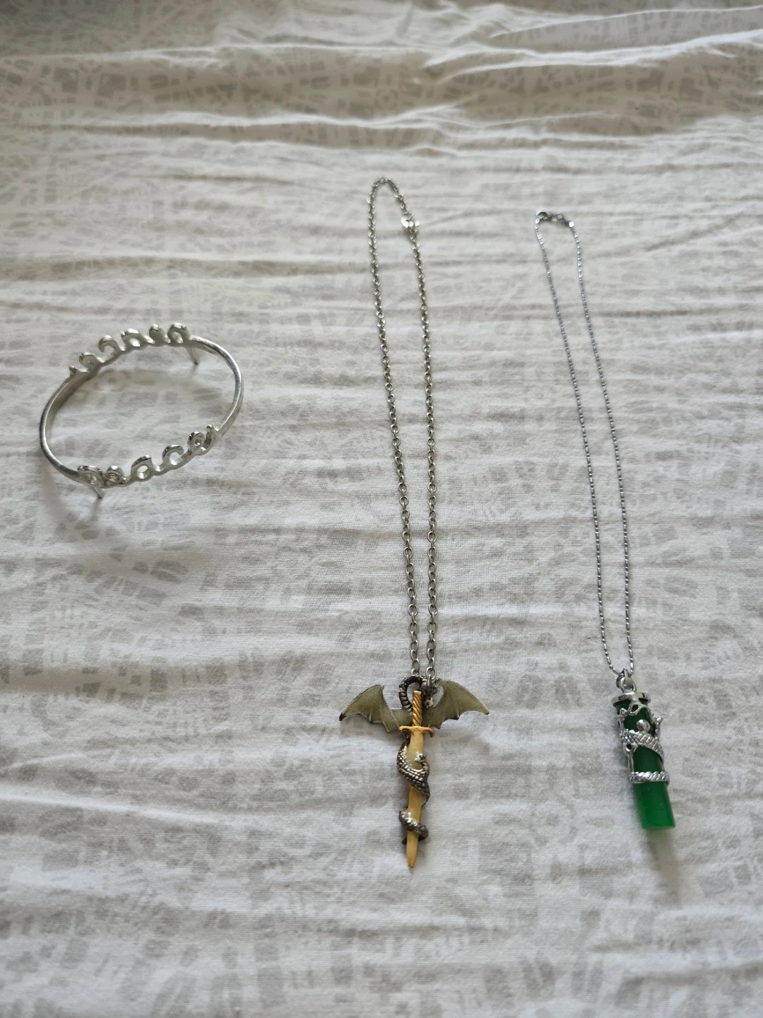 Two pieces of dragon-themed jewellery including a green jade-style pendant necklace, a sword and dragon pendant necklace. The green pendant features a dragon coiled around a cylindrical stone. It's a unique set for dragon enthusiasts!