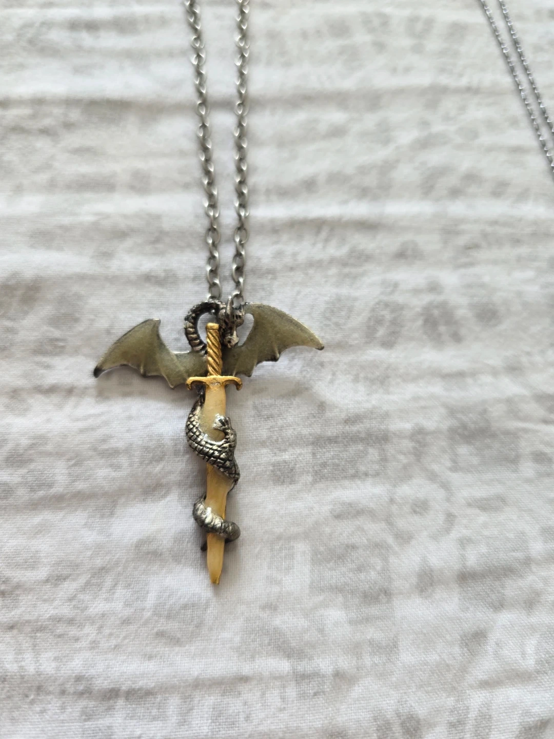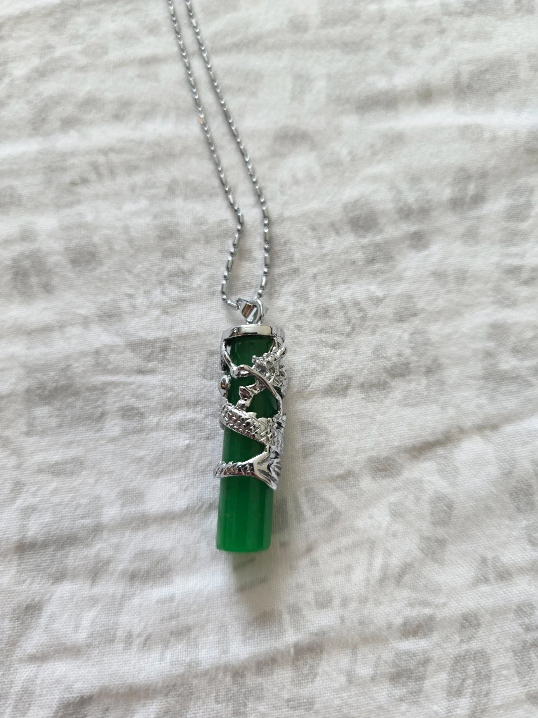Two pieces of dragon-themed jewellery including a green jade-style pendant necklace, a sword and dragon pendant necklace. The green pendant features a dragon coiled around a cylindrical stone. It's a unique set for dragon enthusiasts!