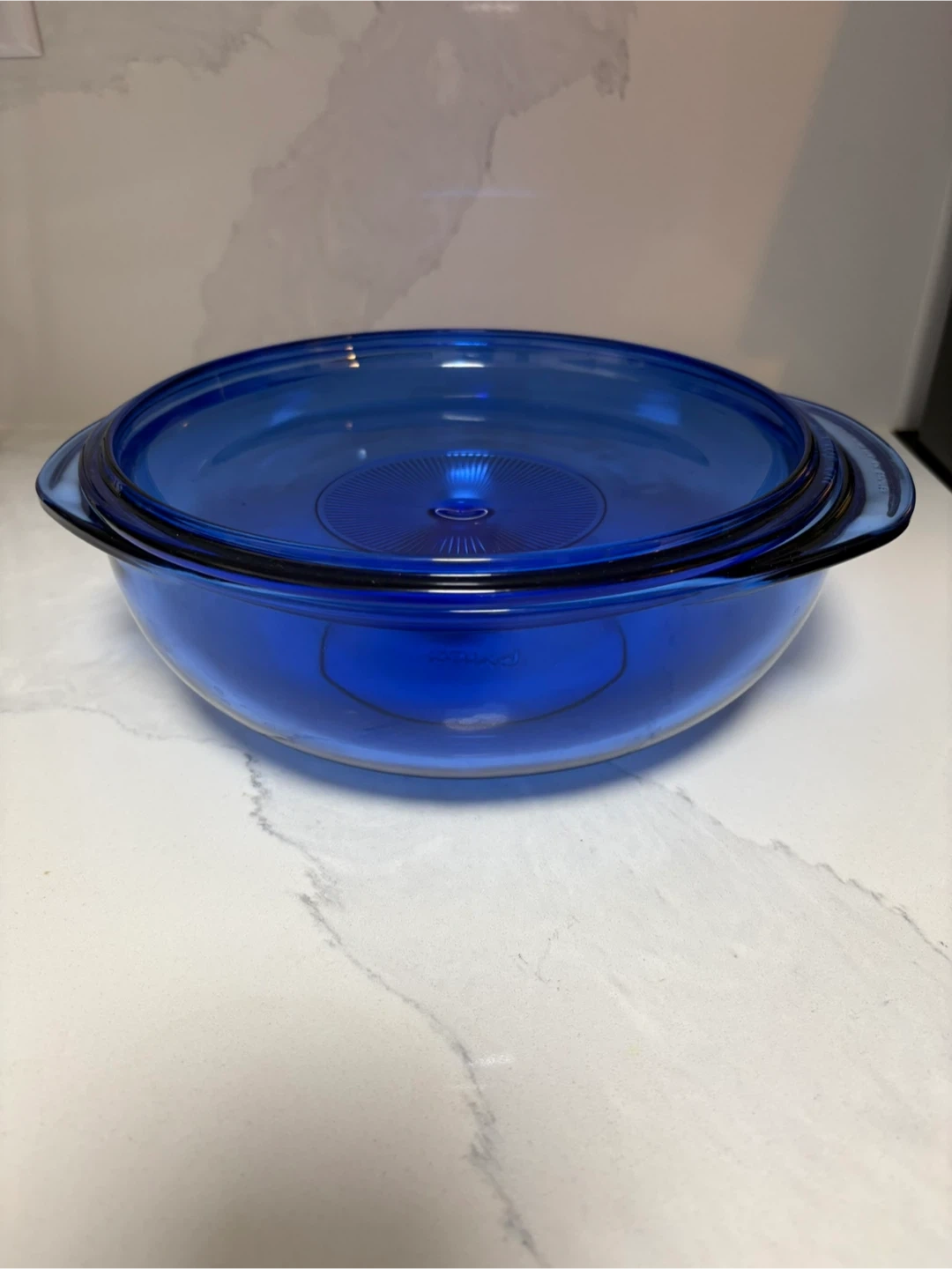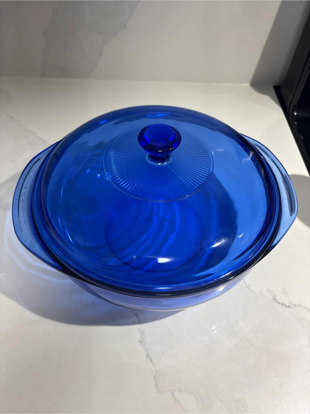 This is a beautiful 2L round cobalt blue glass casserole dish from Pyrex. It comes with a matching glass lid.