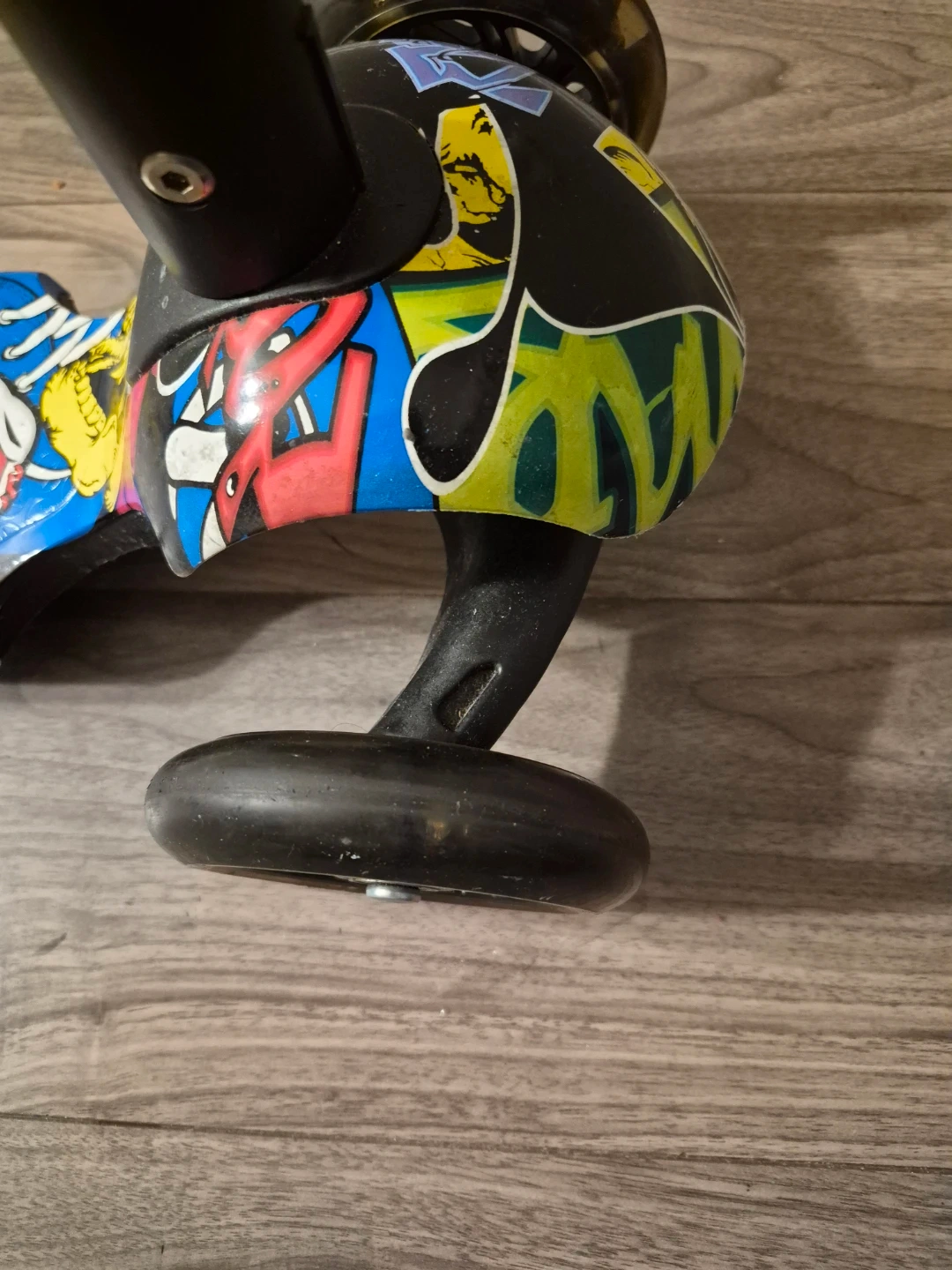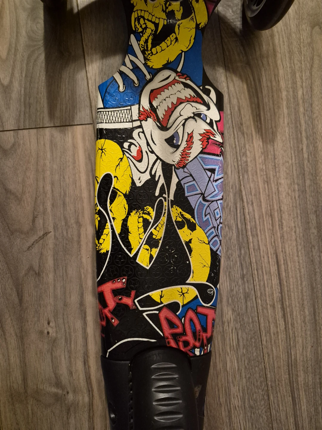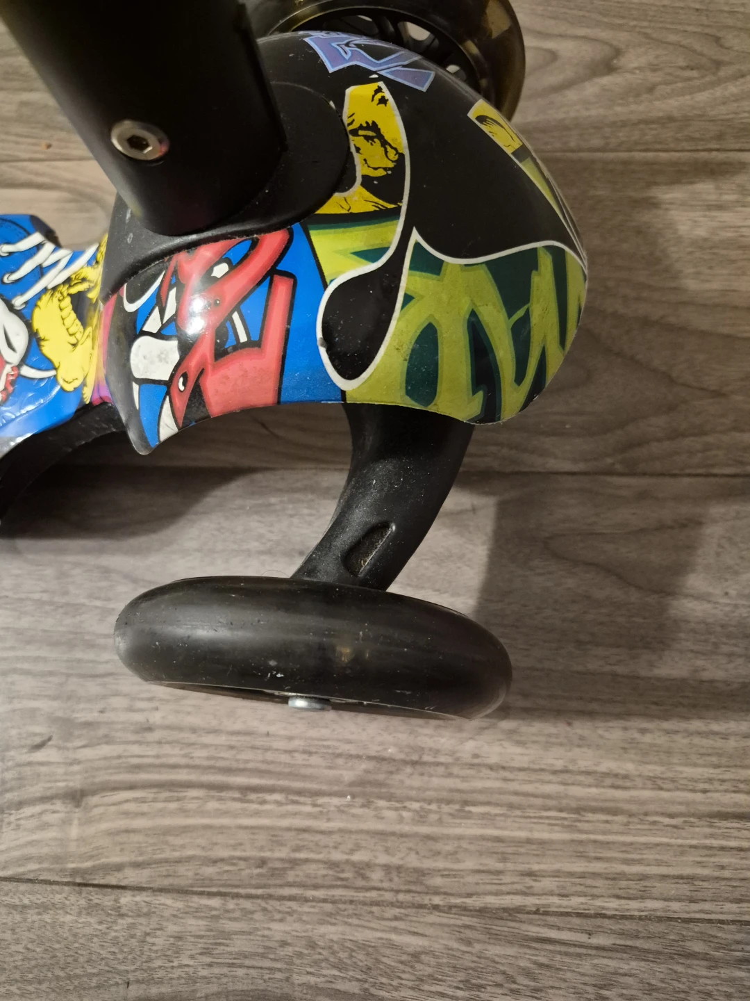 This three-wheel scooter features a fun graffiti-style design. It has a sturdy metal handlebar and black rubber grips for a comfortable hold. The deck is wide enough for stability. It's a great way for kids to get around and have some fun outdoors!