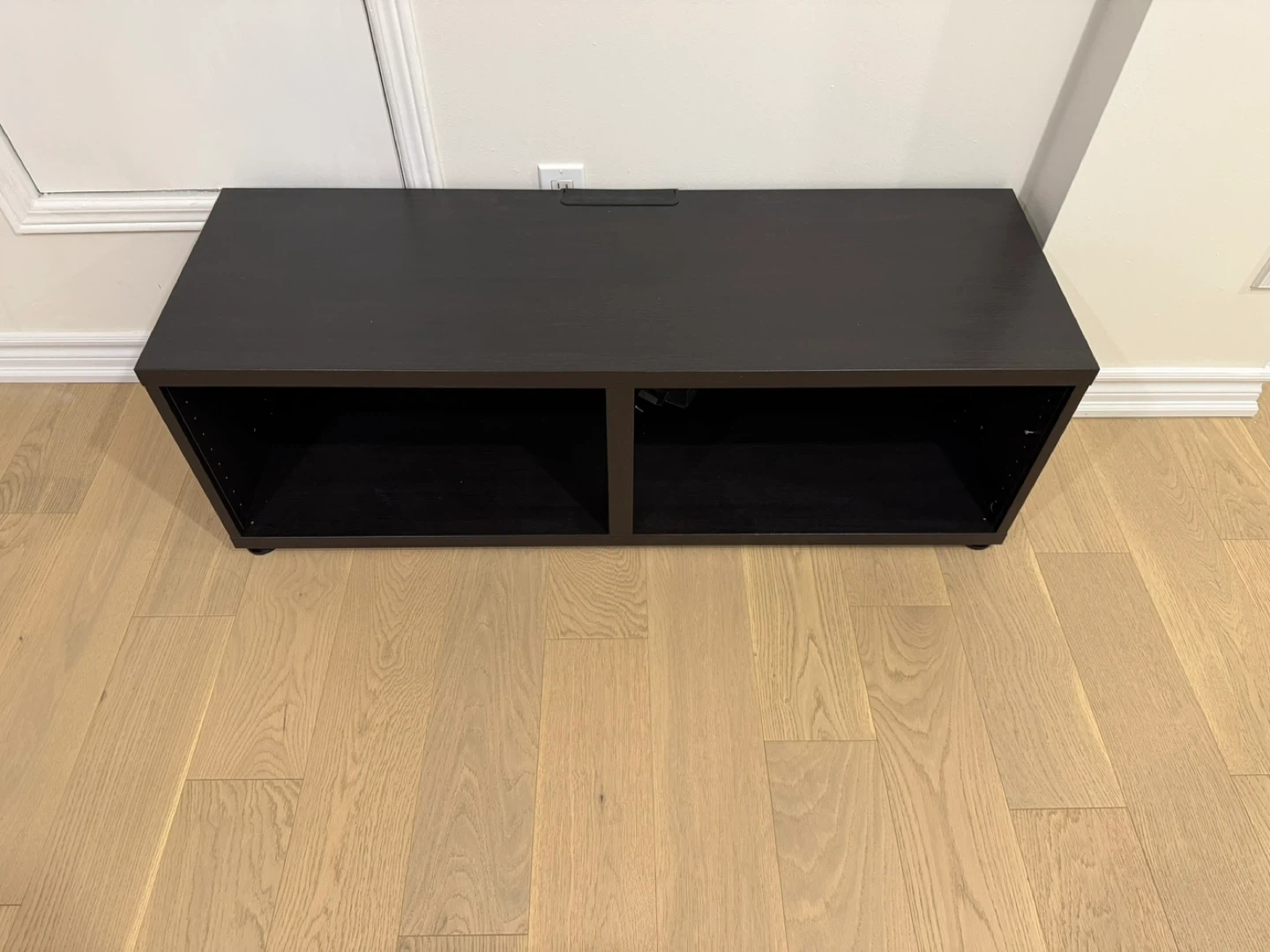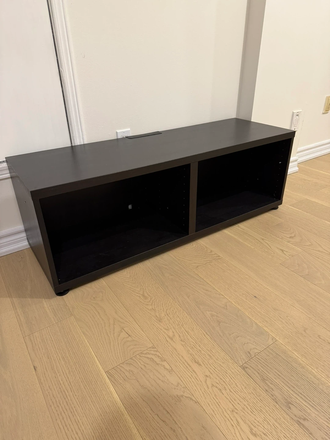 Selling a dark brown TV stand or media console. It's in great shape and ready for a new home! It features two open compartments for easy storage and display