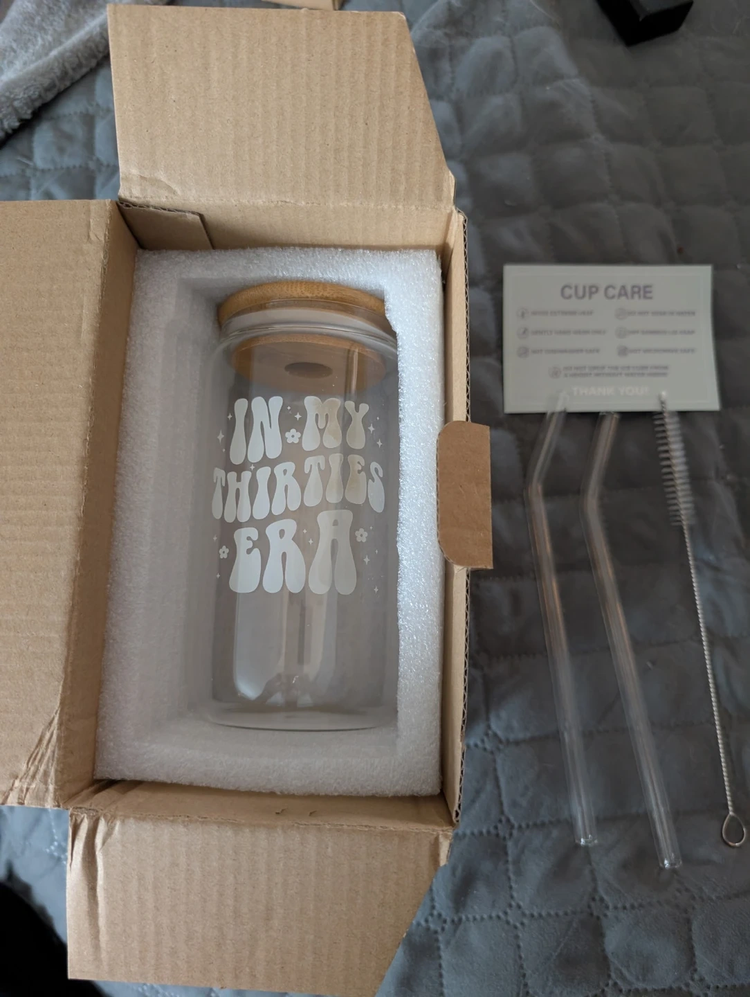 This new in box glass tumbler comes with a bamboo lid and two reusable glass straws, including a cleaning brush. It's perfect for your daily beverages. The cup has a fun 'In My Thirties Era' graphic. Great economical birthday gift for person entering their adulting time. Public Meetup place at 2294 Kingston road which is Tim Hortons South Scarborough main intersection Midland and Kingston road cash please