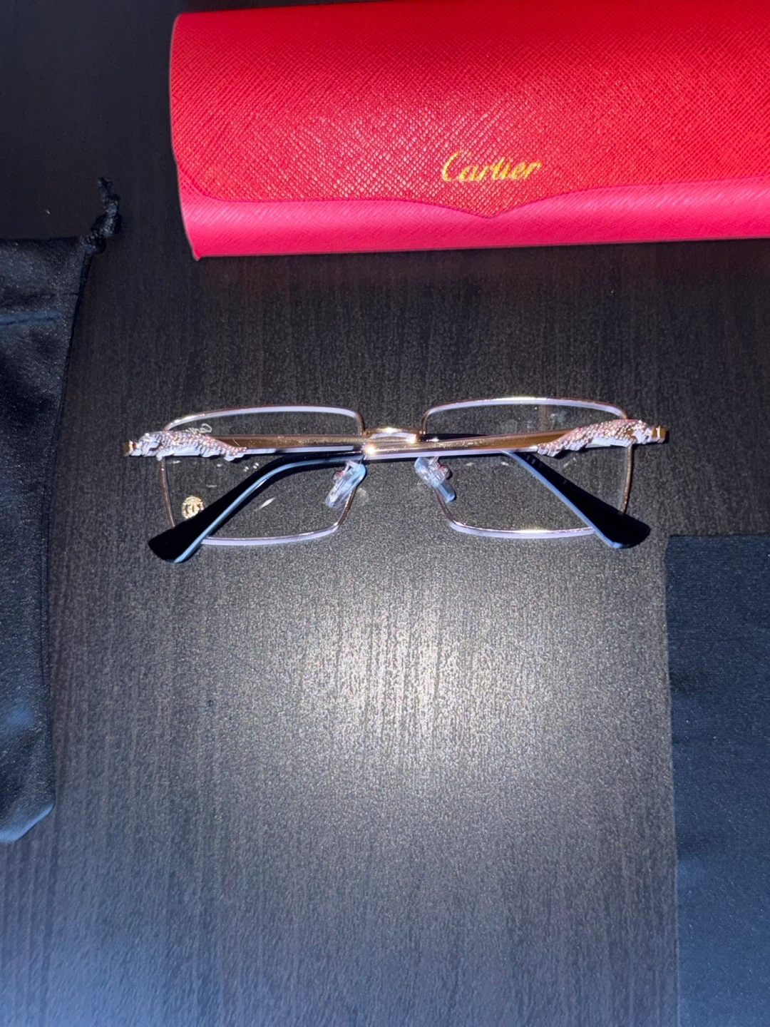 These are Cartier eyeglasses. They come with the original red case, box, cleaning cloth, and a pouch. The frames are silver and gold coloured with blue accents on the earpieces. Includes authenticity card.