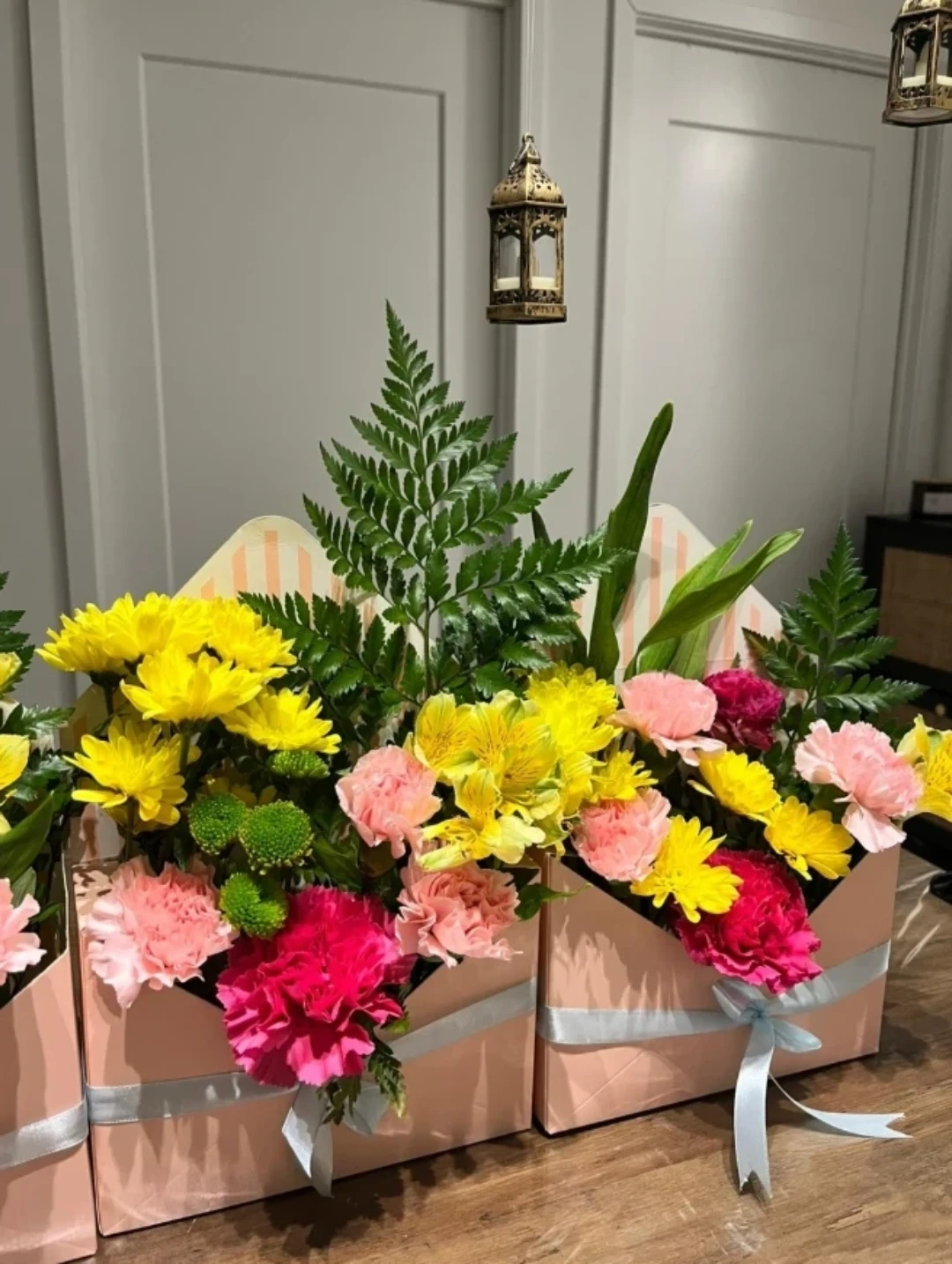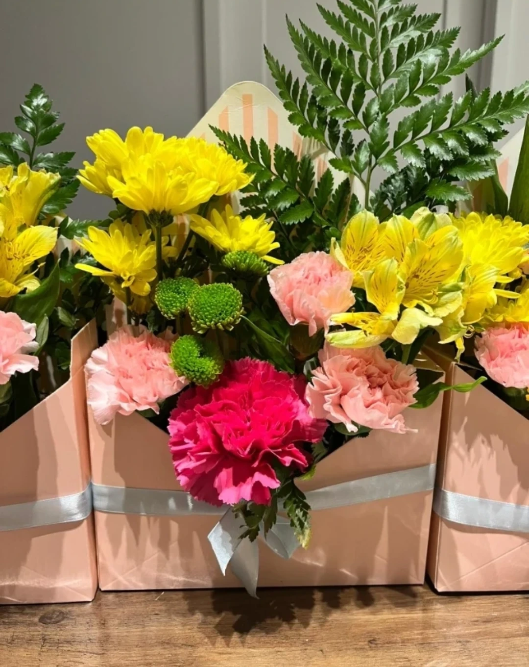A vibrant assortment of fresh flowers, including yellow chrysanthemums, pink carnations, and alstroemeria, presented in a charming pink envelope-style box. The arrangement is finished with a satin ribbon. Perfect for adding a splash of colour and cheer to any space!