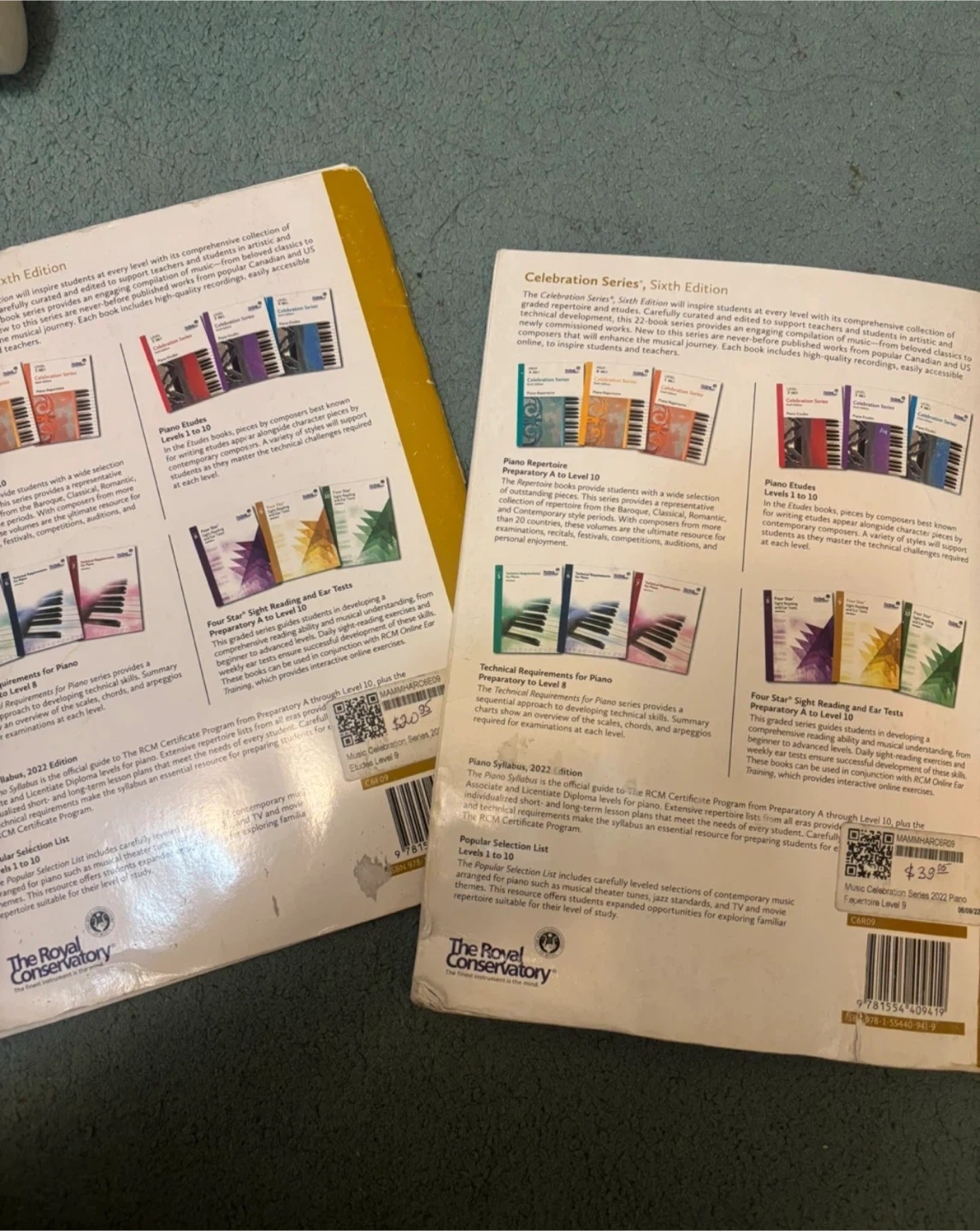 Two books from The Royal Conservatory Celebration Series, Level 9, Sixth Edition. Includes 'Piano Etudes' and 'Piano Repertoire'. Both books are in good condition and originally bought for around $100.