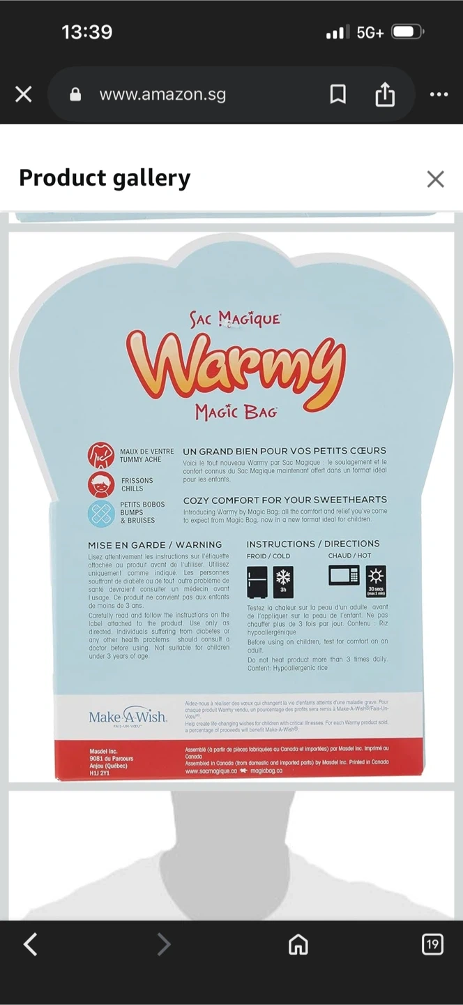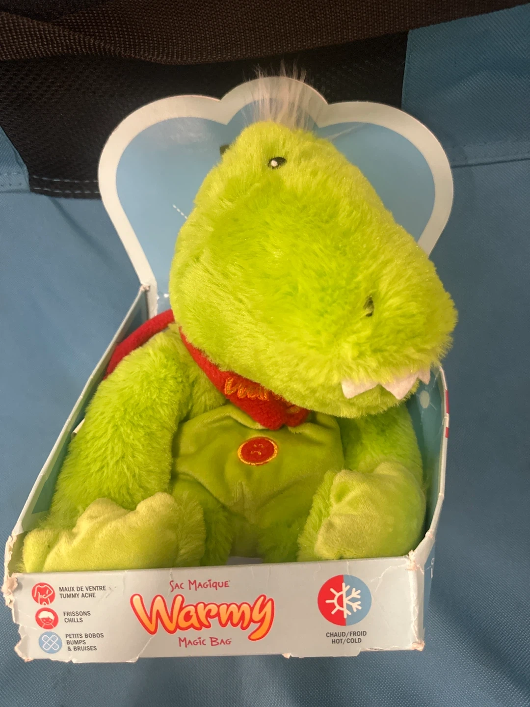 This is a Warmy Magic Bag, a plush toy designed for comfort and relief. It's suitable for tummy aches, chills, bumps, and bruises. It can be used warm or cold.
