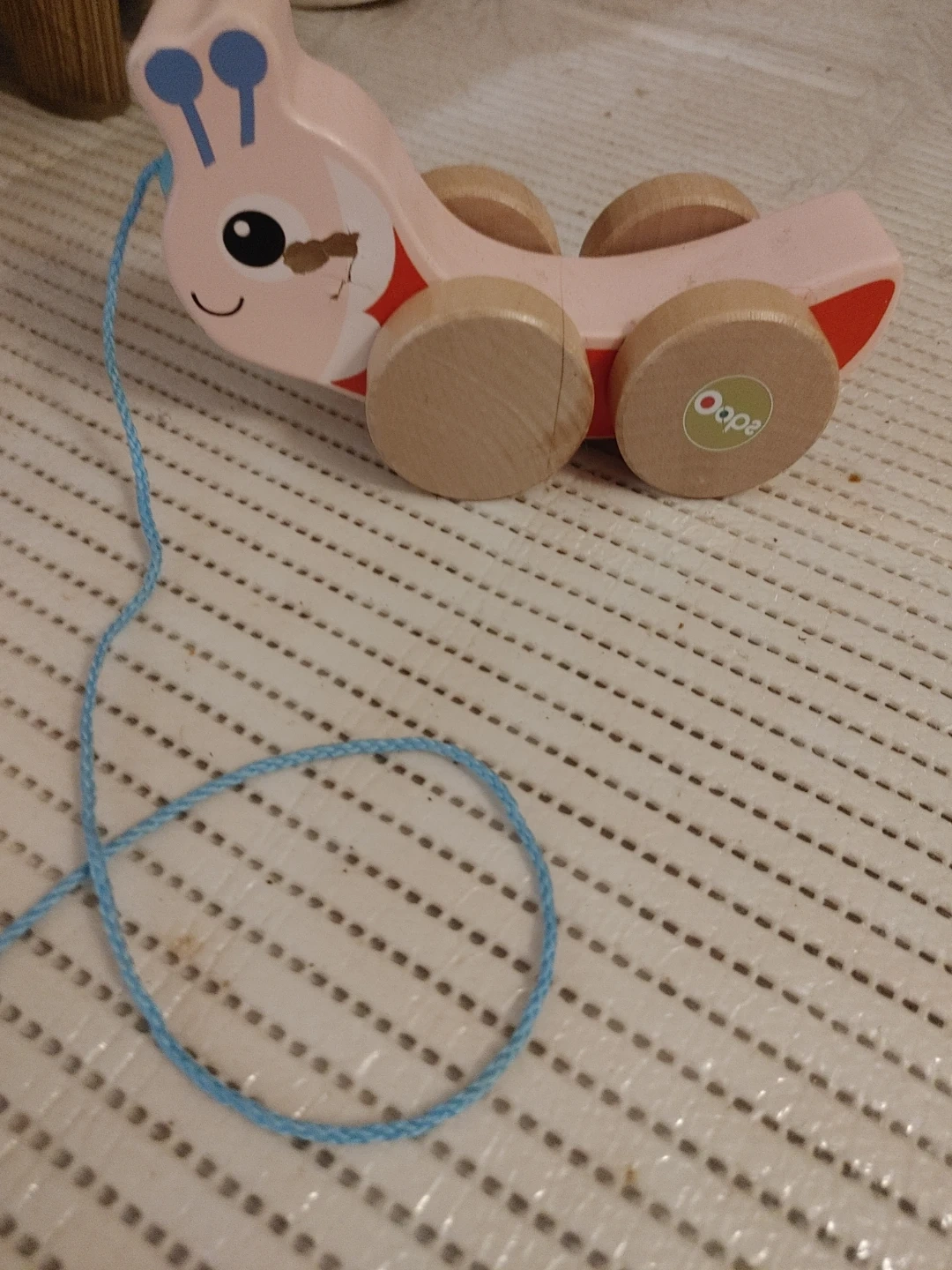 This is a cute wooden snail pull toy. It's made of wood and has a blue string for pulling. It's suitable for toddlers and young children.small paint chip /missing pull knob