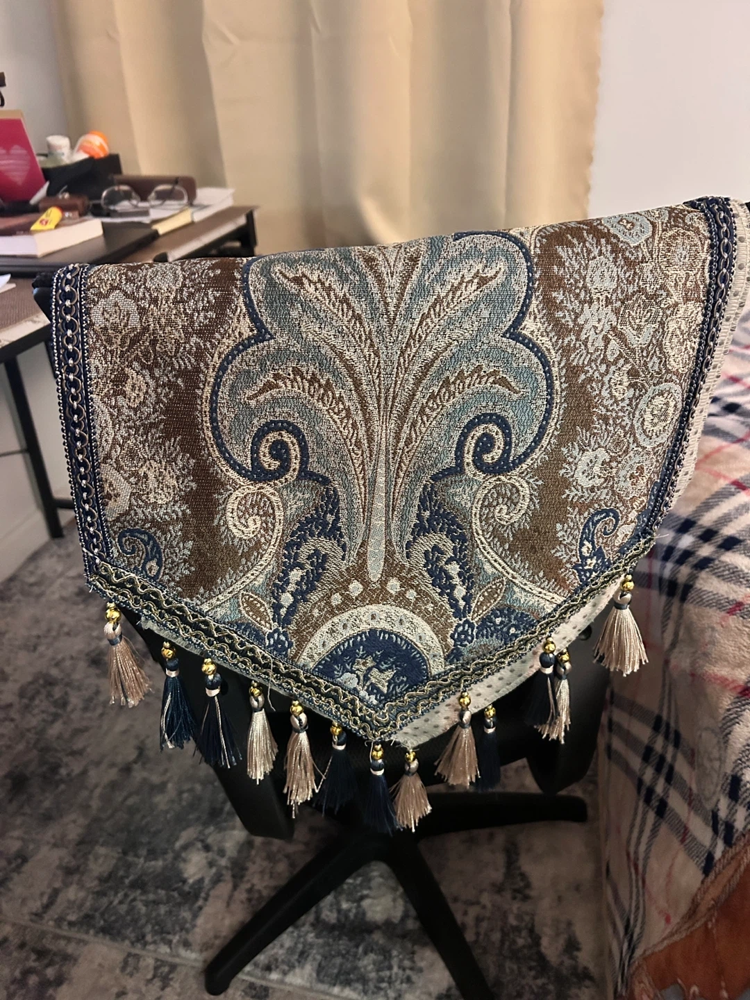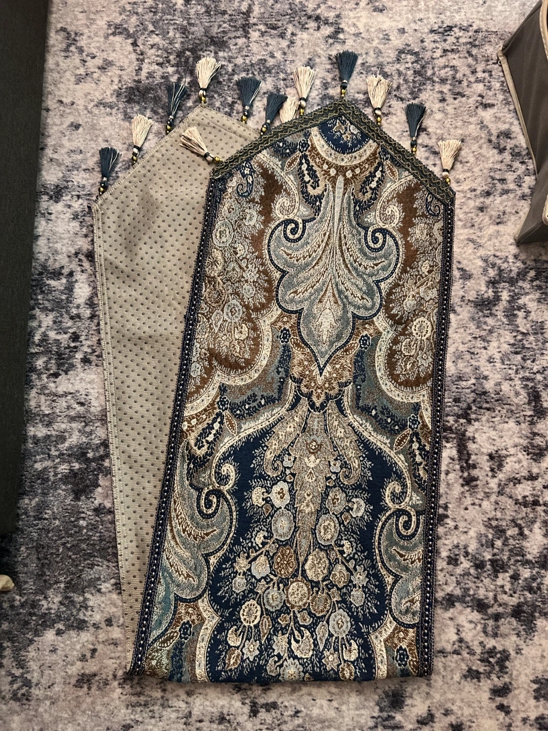 Perfect for coffee table decoration. Features a beautiful paisley pattern in blue, brown, and cream. It's adorned with tassels along the bottom edge. The backing has a non-slip texture.