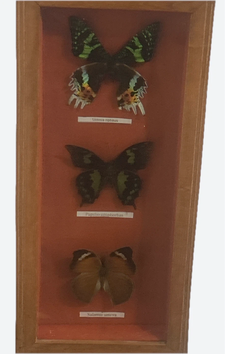 Display of three different types of butterflies in a wooden frame