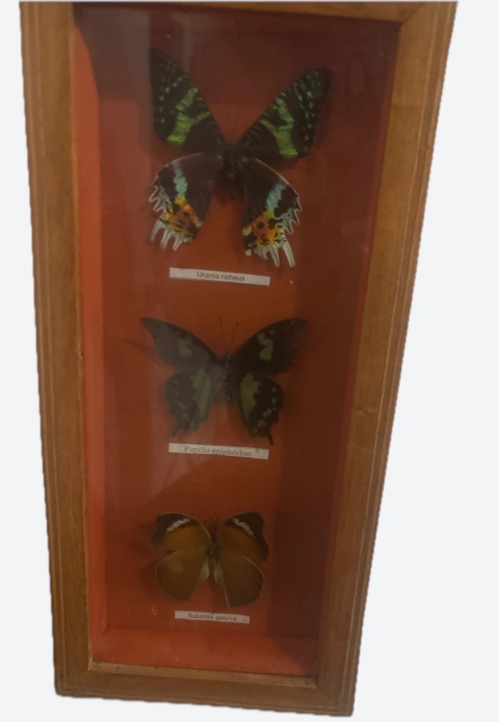Display of three different types of butterflies in a wooden frame