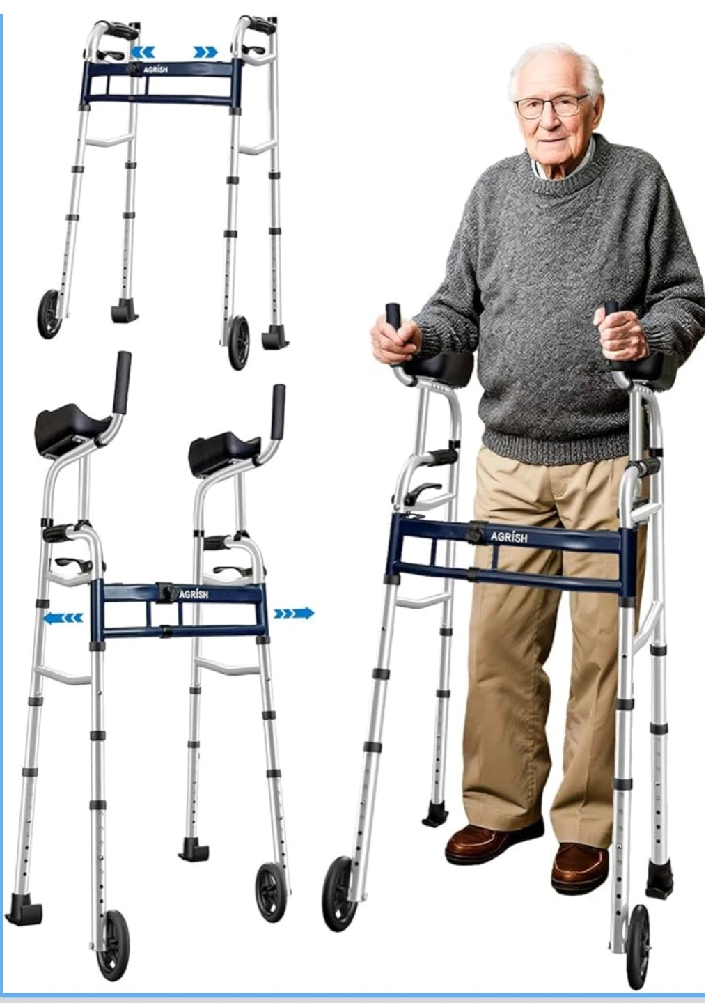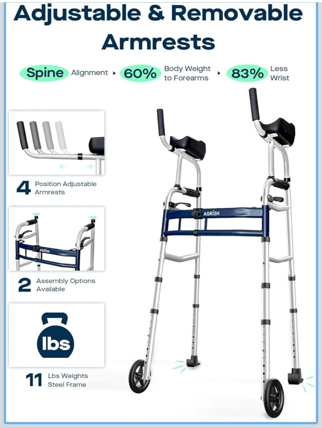 This AGRISH walker offers 5 width adjustments, ranging from 18" to 22". It features adjustable and removable armrests, with 4 position adjustments. The steel frame weighs 11 lbs. It's narrow for easy passage through small spaces.