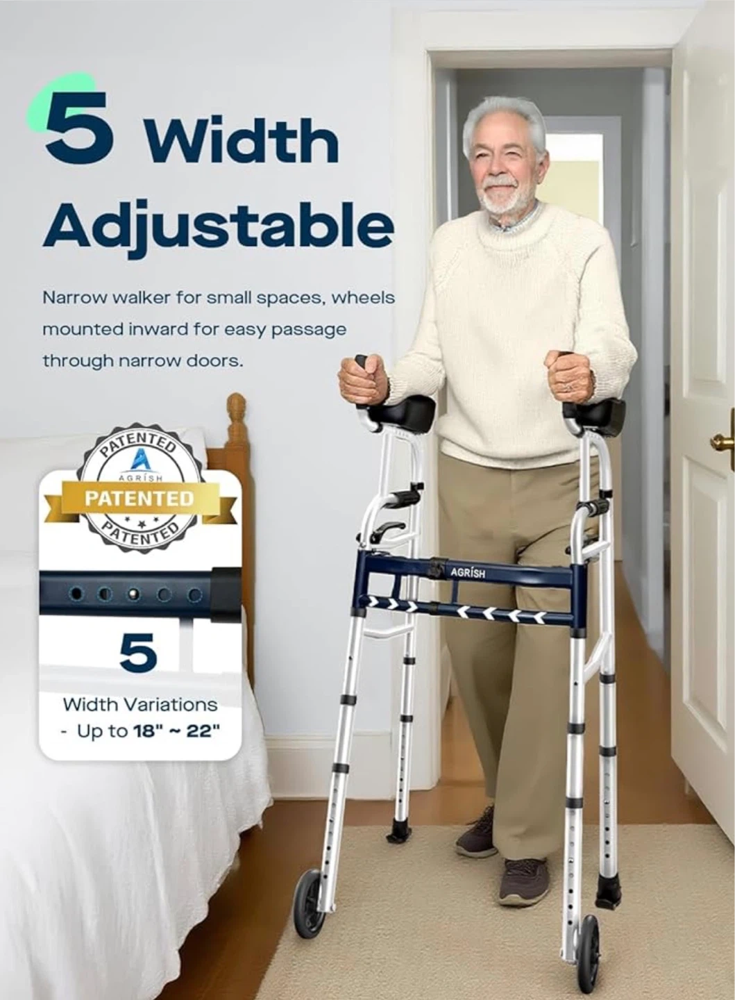 This AGRISH walker offers 5 width adjustments, ranging from 18" to 22". It features adjustable and removable armrests, with 4 position adjustments. The steel frame weighs 11 lbs. It's narrow for easy passage through small spaces.