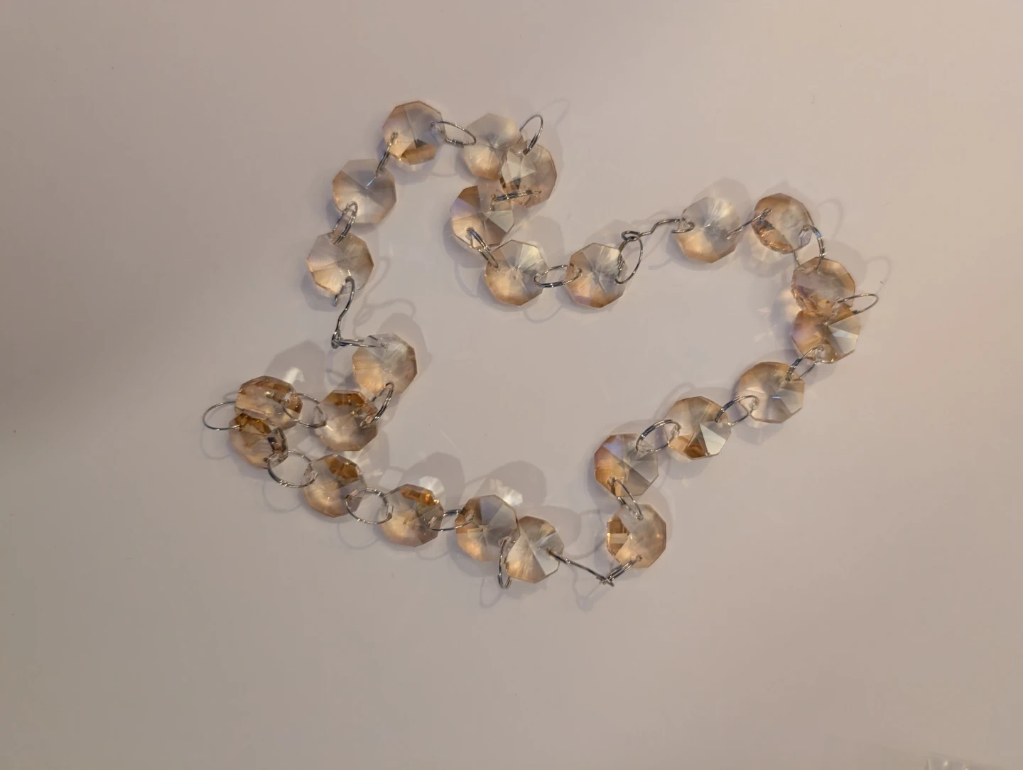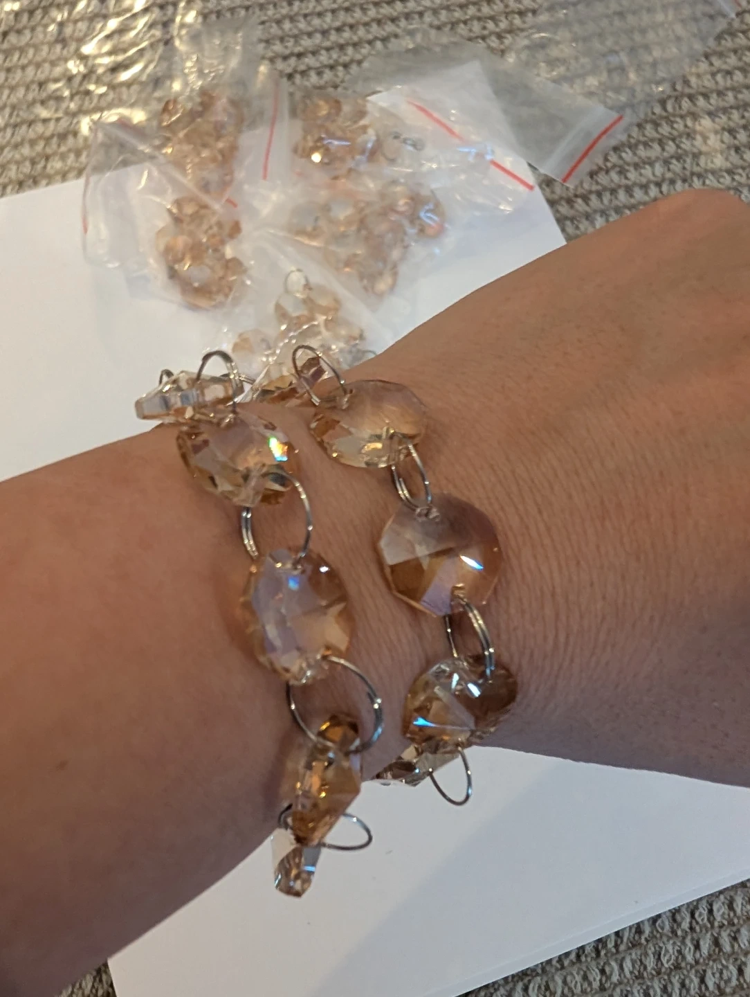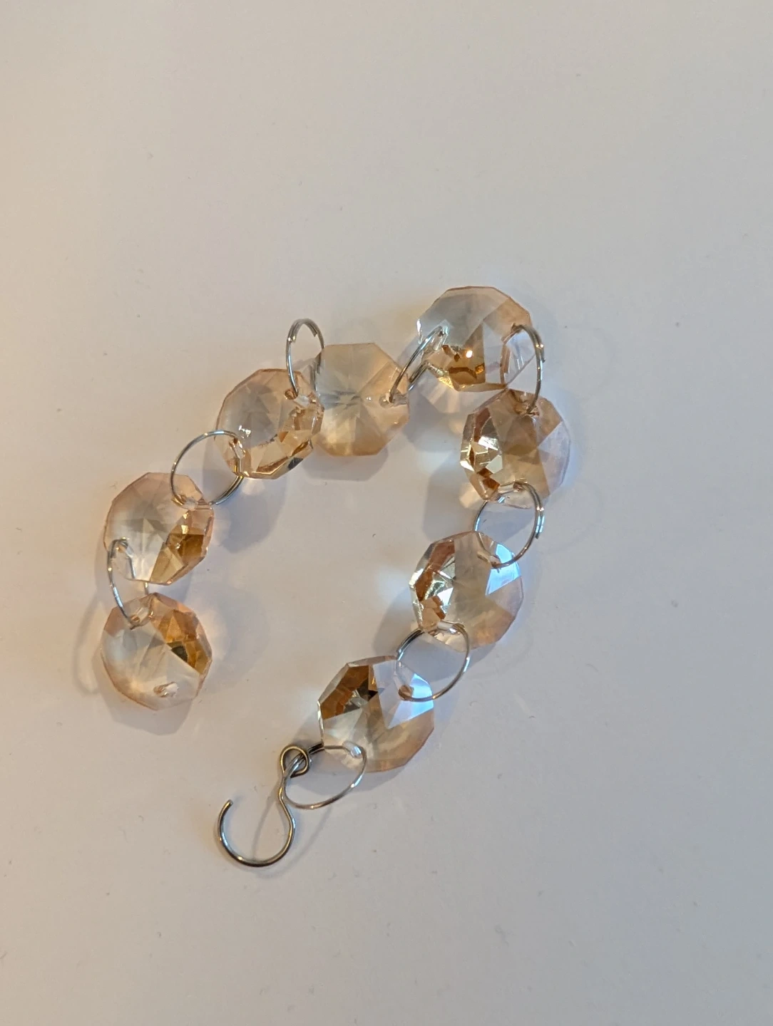 This set includes ten strands of sparkling crystal chandelier pendants. Each strand is made of faceted clear champagne-coloured beads linked with silver-toned metal rings. They've got a hook on one end for easy hanging. Great for adjusting the length to make your own jewelry like brecelets, earings or necklaces.