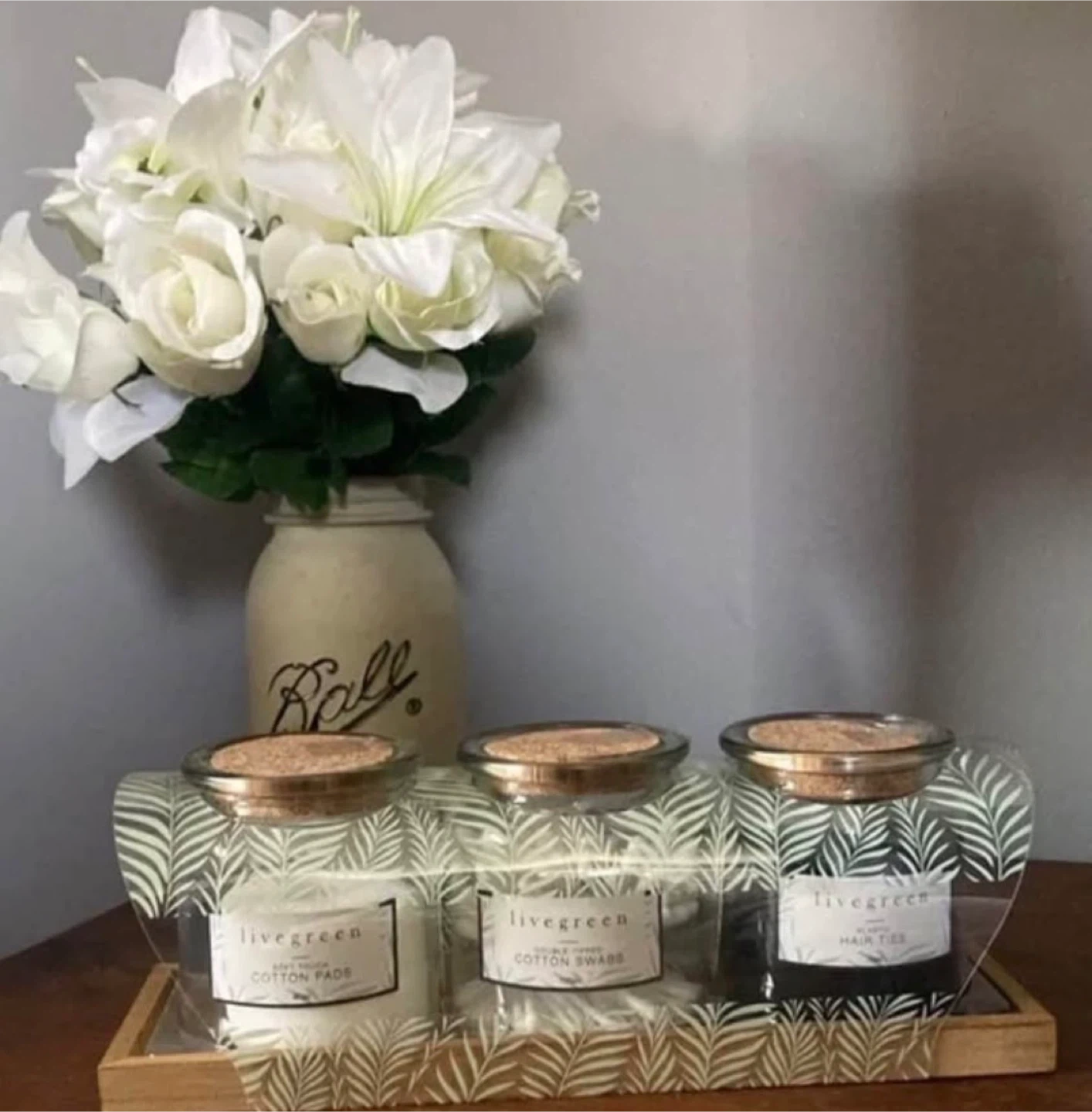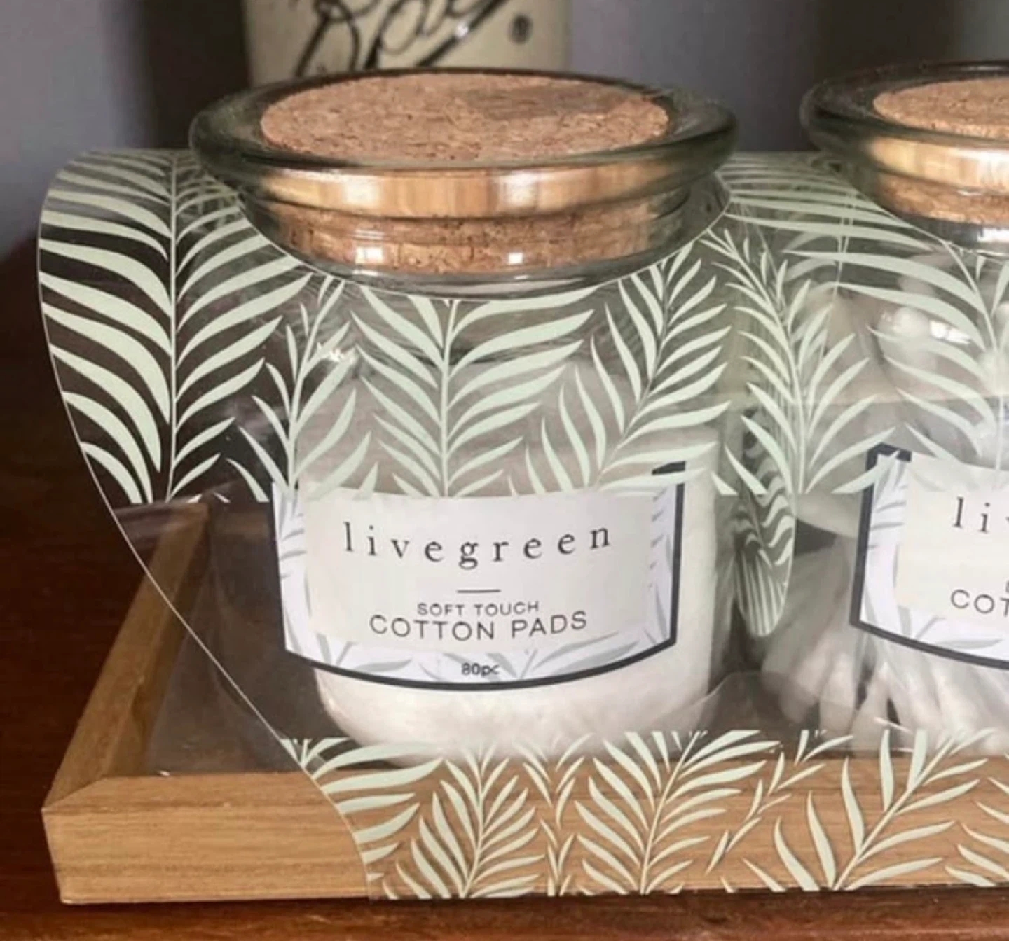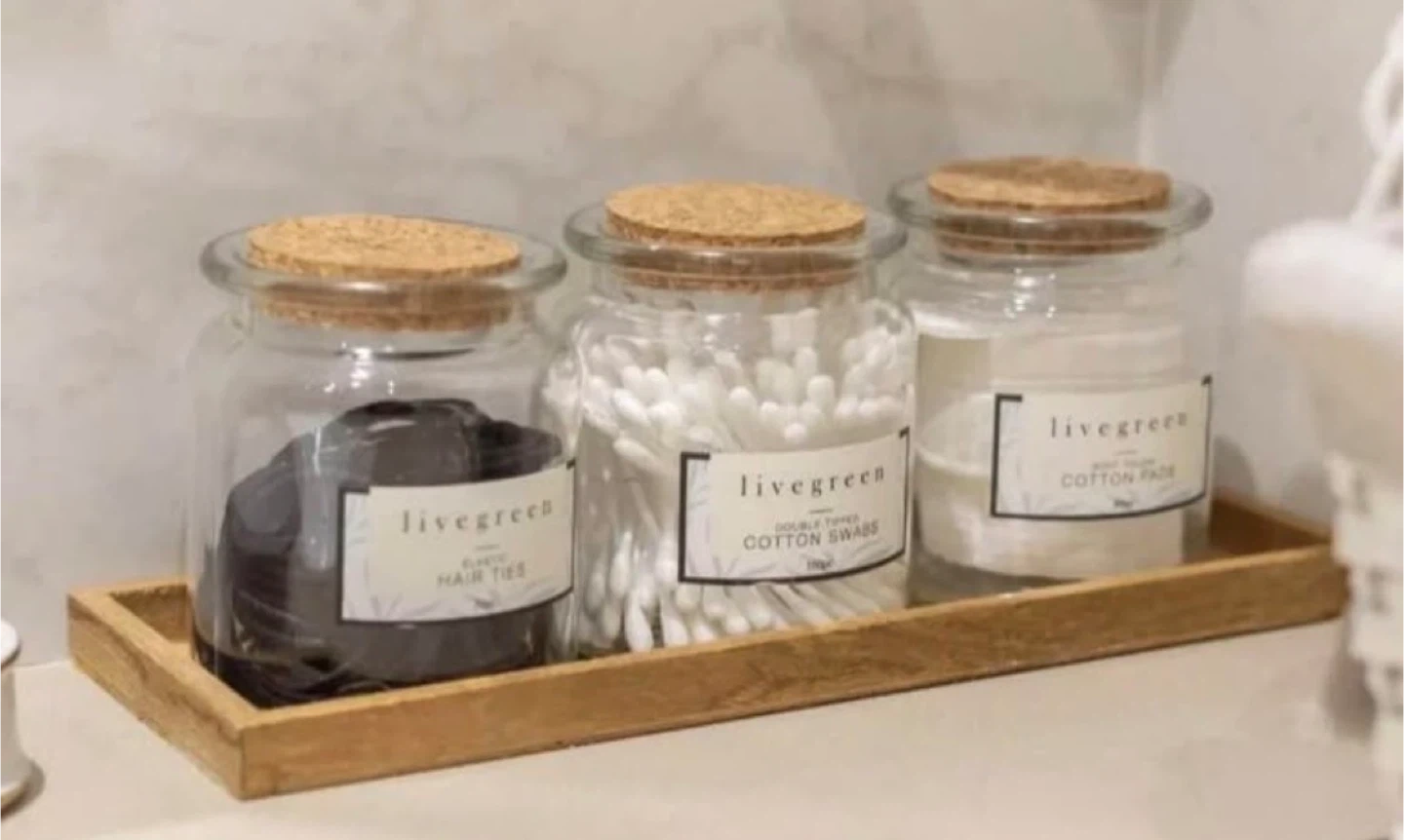 I'm selling a Livegreen soft touch cotton pads and swabs set. This set includes jars filled with cotton pads, cotton swabs, and hair ties. It's a stylish and practical addition to any bathroom or vanity