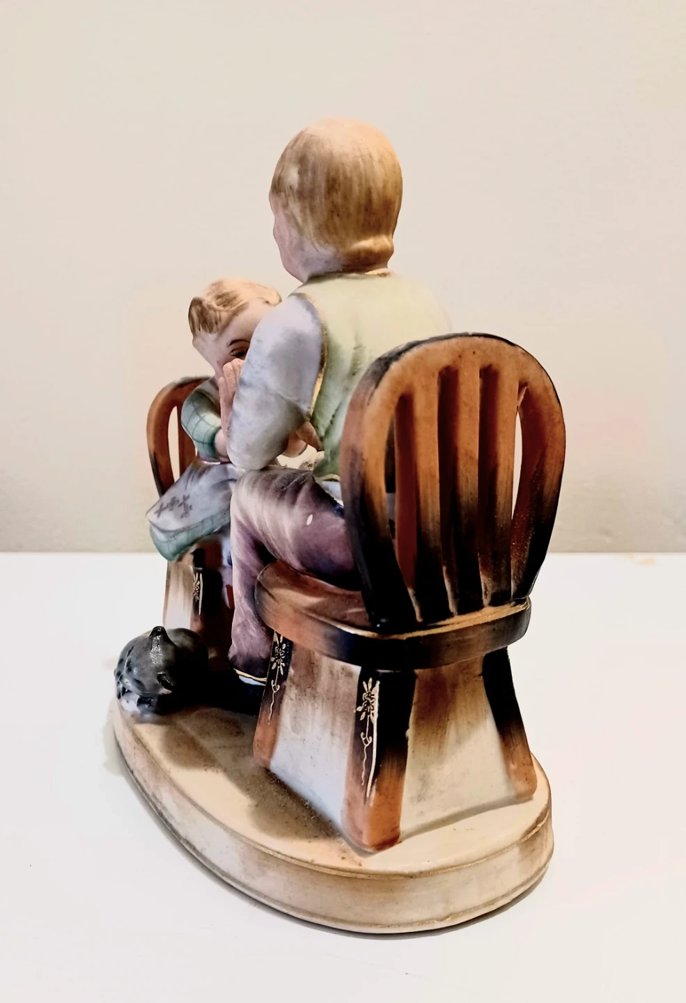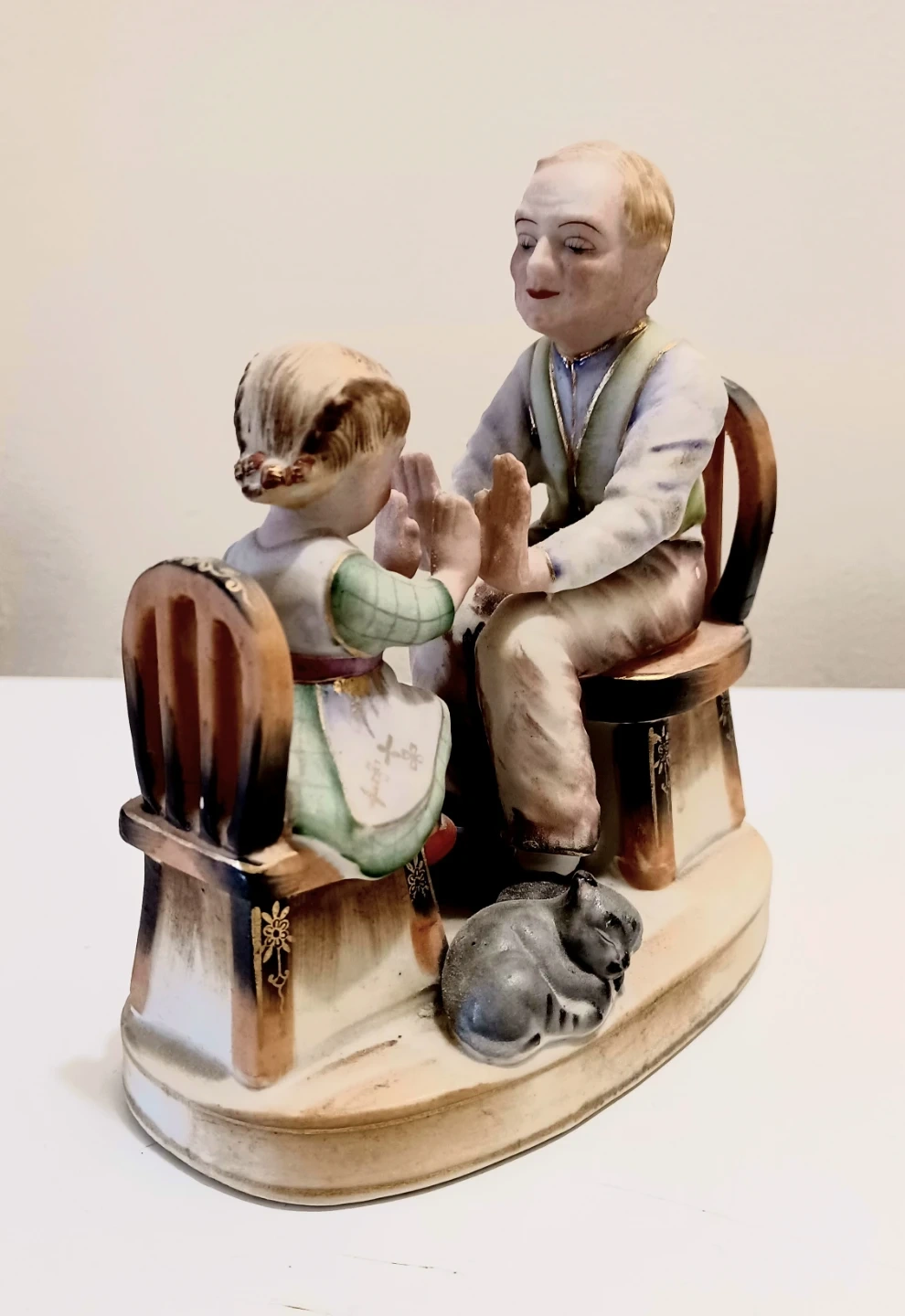 Stafford China figurine depicting an elderly man and a young girl playing patty cake, with a cat watching nearby. The figurine is hand-painted and in Very Good condition, showcasing intricate details and vibrant colours.