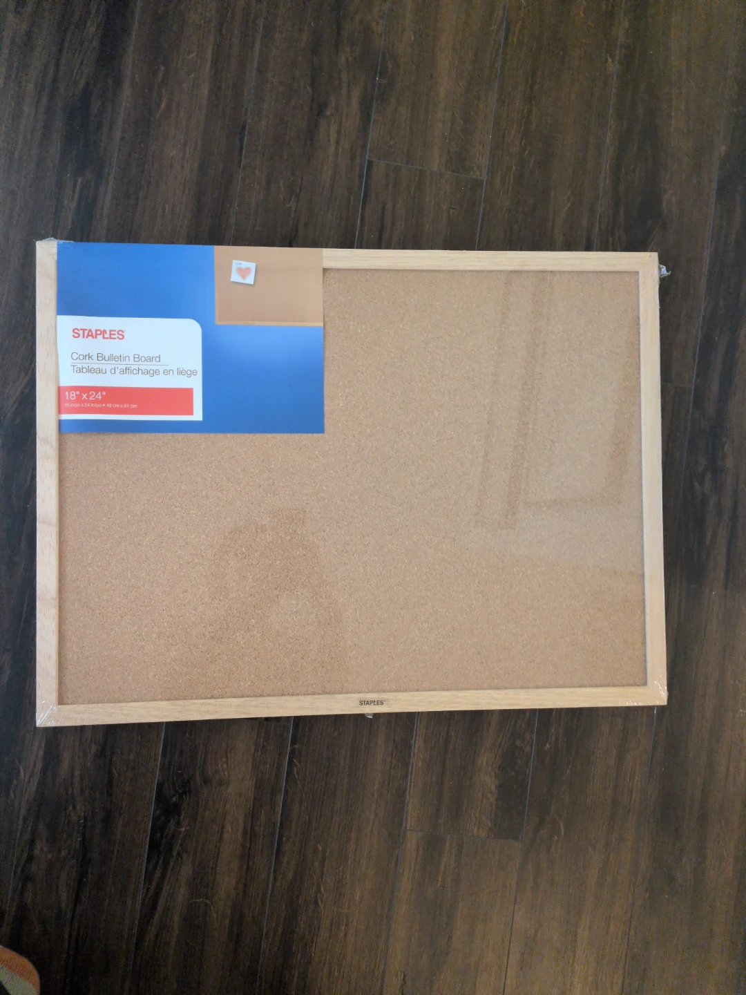 This is a Staples cork bulletin board, measuring 18 inches by 24 inches. It features a natural cork surface for pinning notes and reminders. This board is great for home offices or classrooms!