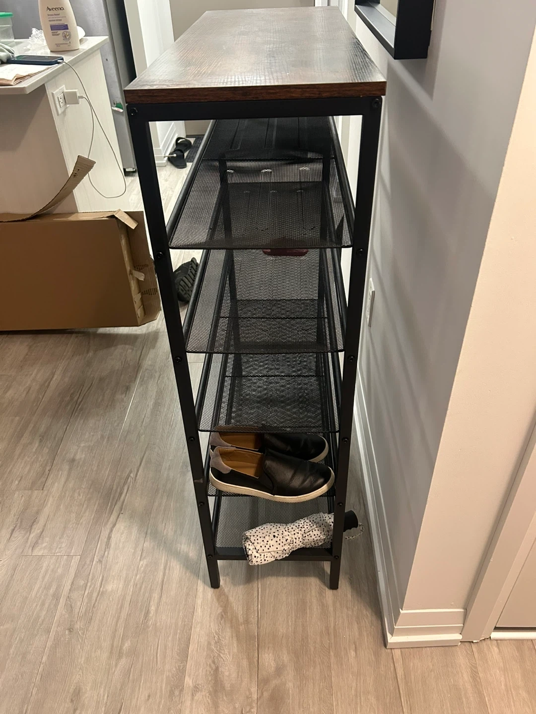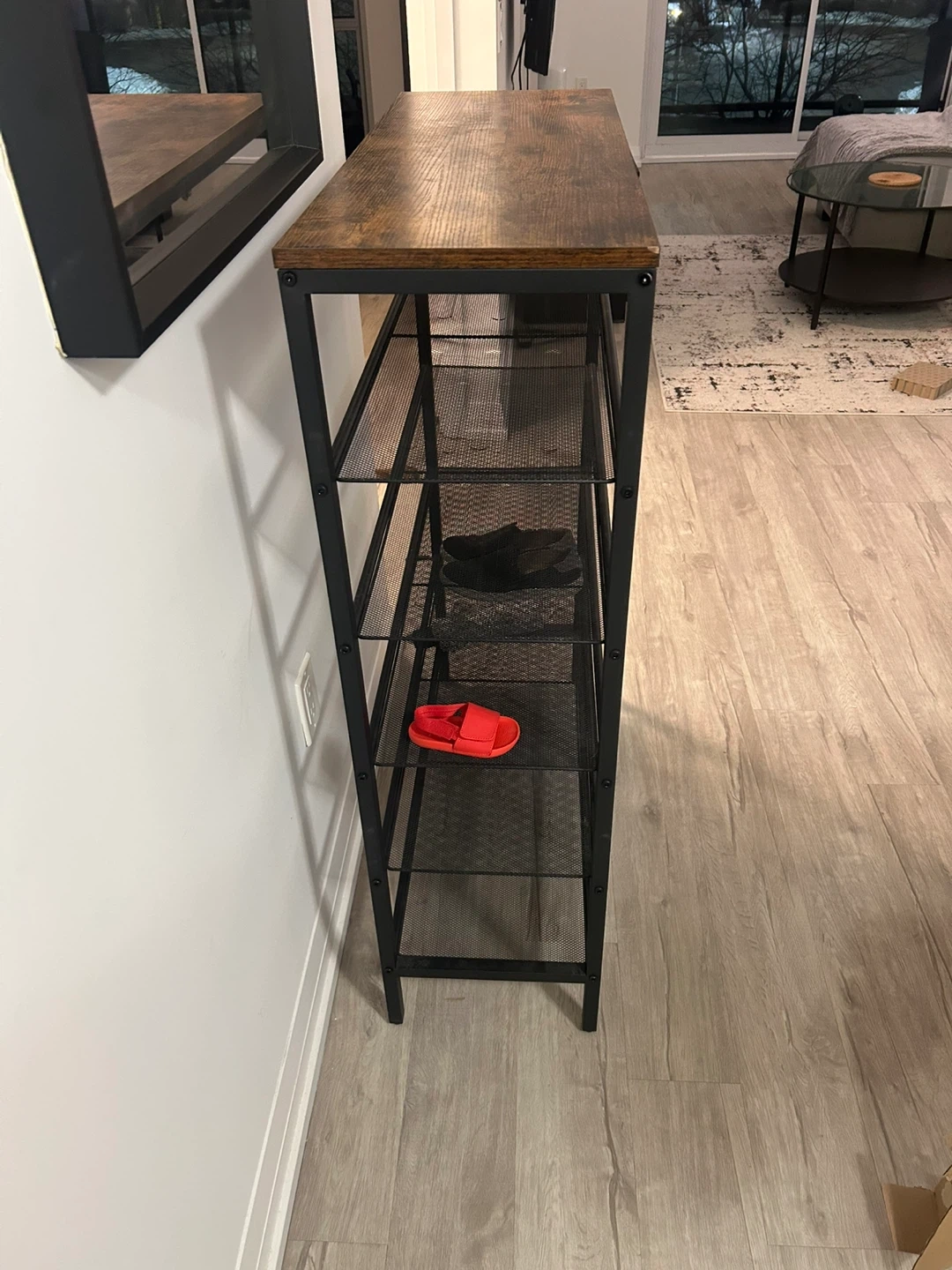 This industrial-style shoe rack features a rustic wood-grain top and a black metal frame with five mesh shelves. It's great for organizing footwear in your entryway or closet. The slim profile makes it a good fit for tighter spaces. Organize your kicks in style!
