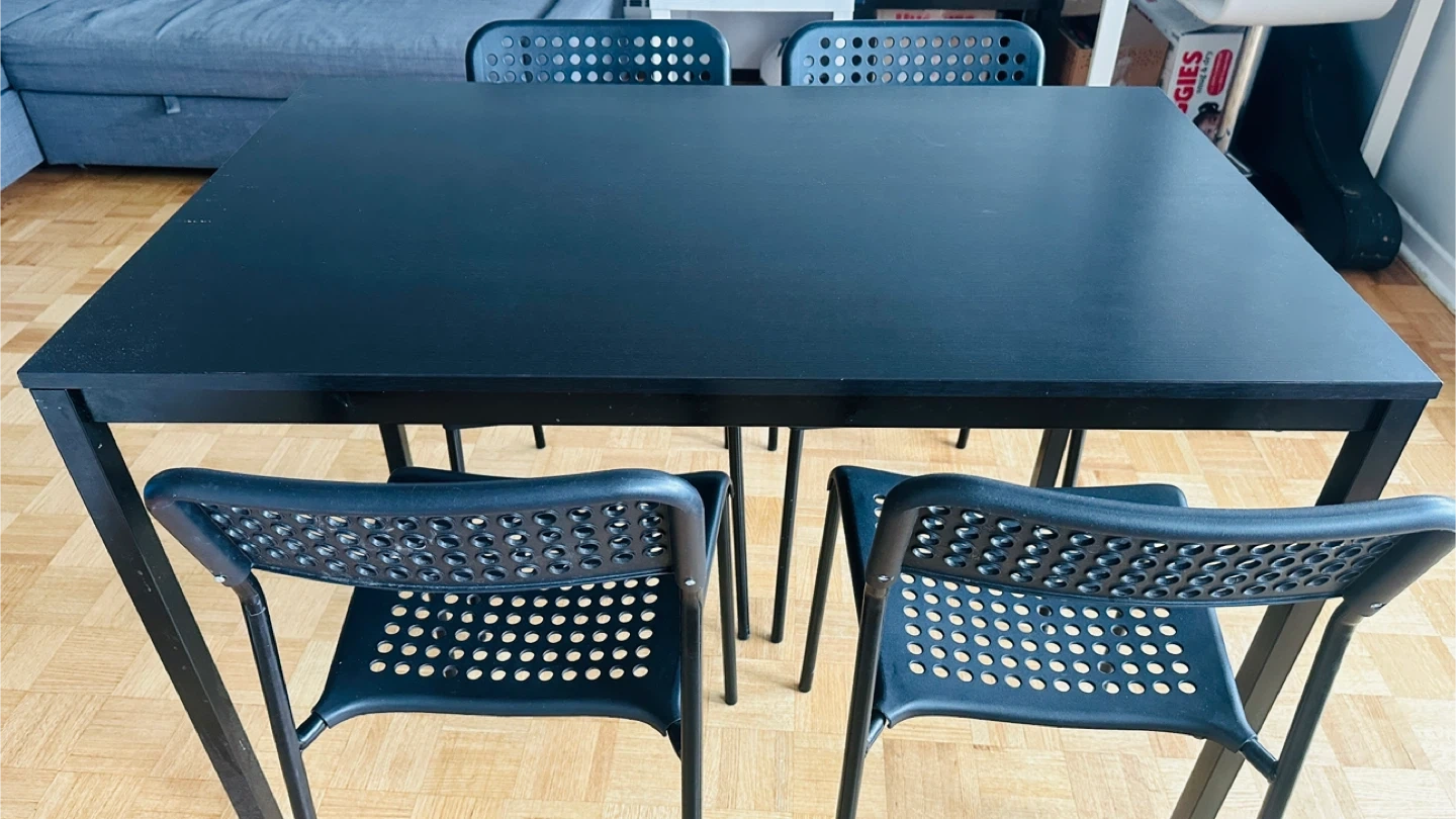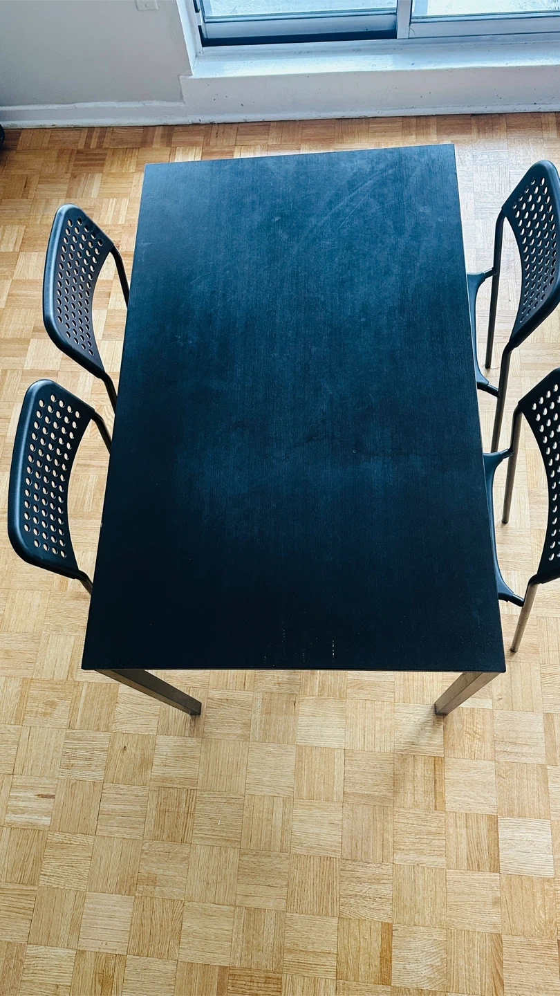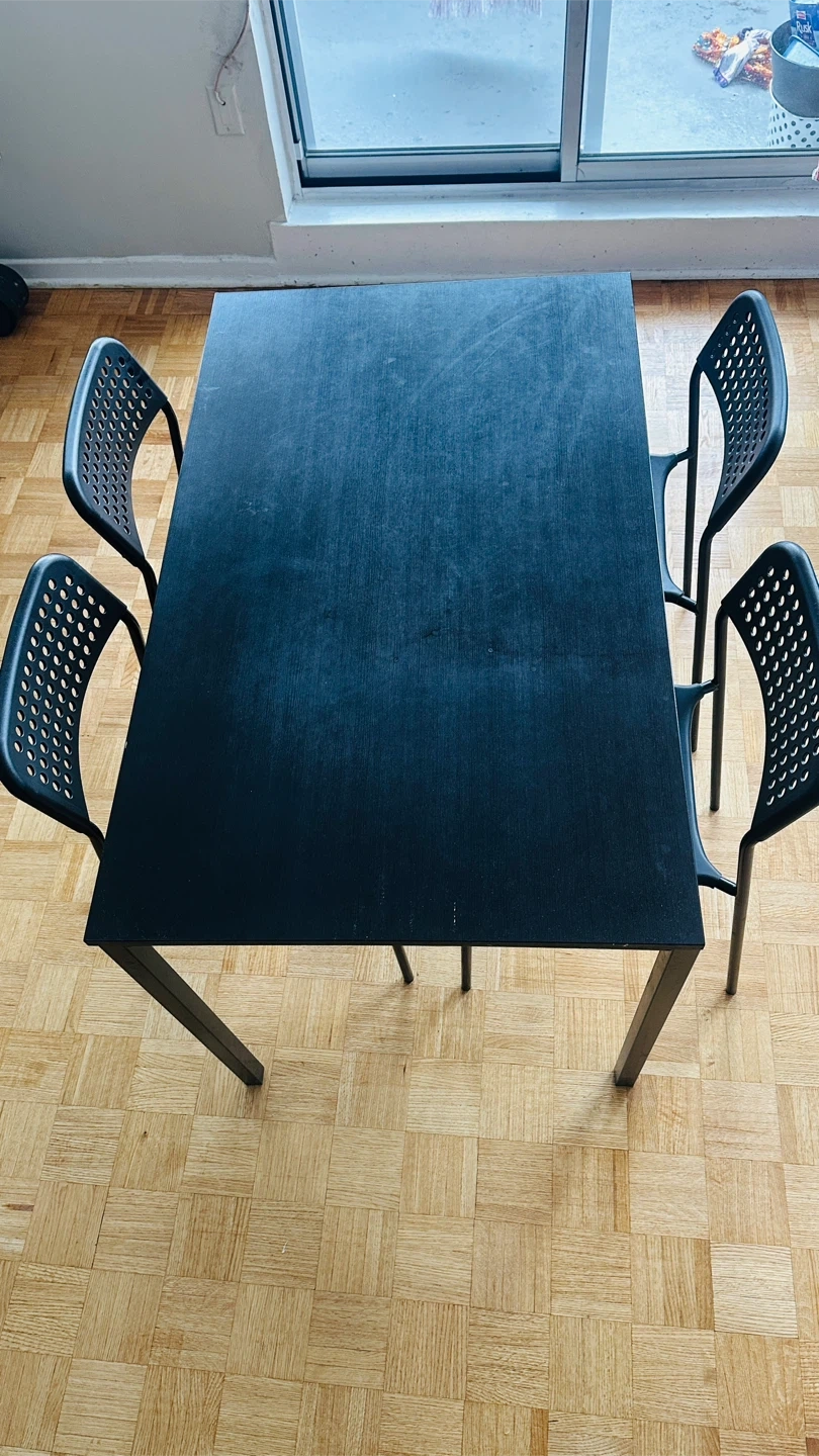 A black dining table with four matching black chairs. It's a simple set for a small dining area. The table has a wood-like finish and metal legs. The chairs are made of plastic with a perforated design.