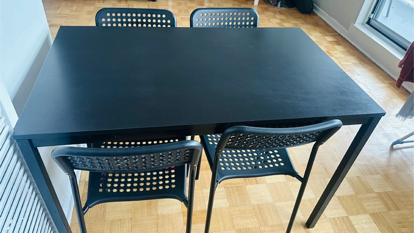 A black dining table with four matching black chairs. It's a simple set for a small dining area. The table has a wood-like finish and metal legs. The chairs are made of plastic with a perforated design.