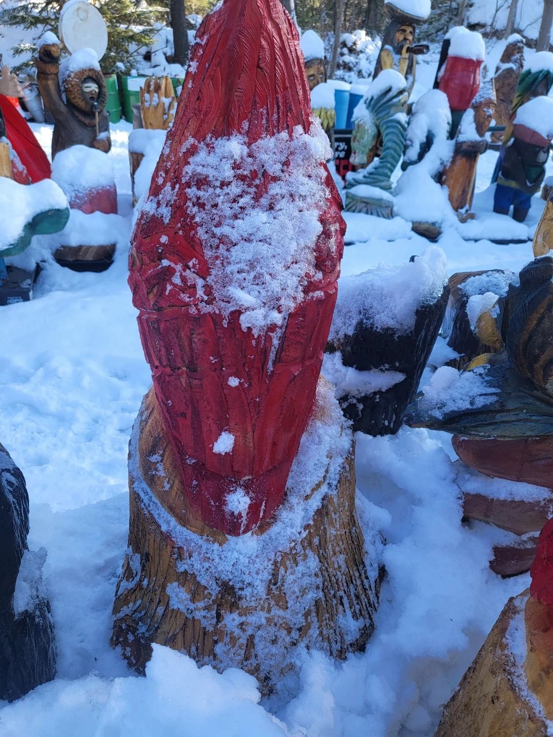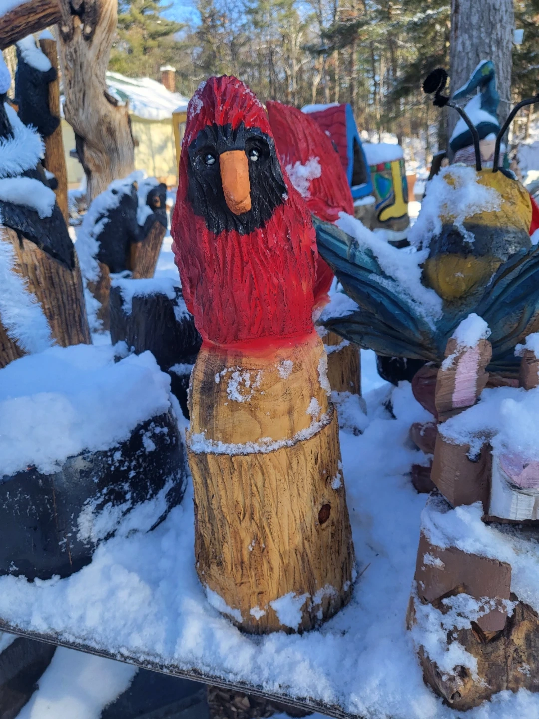 This chainsaw carving cardinal. It's painted bright red with a black and orange beak and black eyes. The base is a natural wood log. This unique piece would add a splash of colour to any garden or home decor!