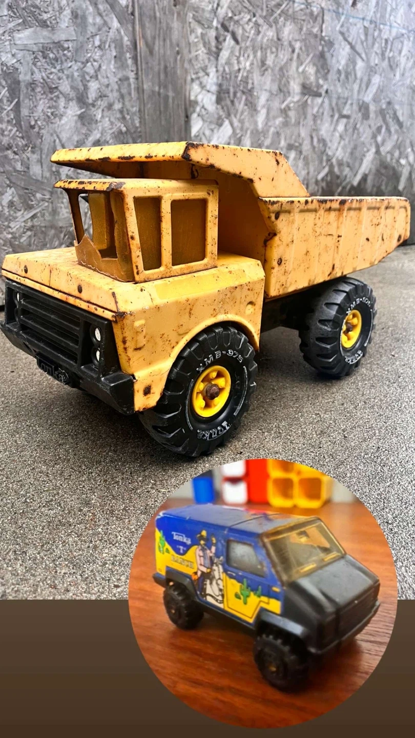 A classic yellow Tonka dump truck showing some wear. It's accompanied by a smaller Tonka van with Western-themed decals. Both are metal toys. Original 1970s