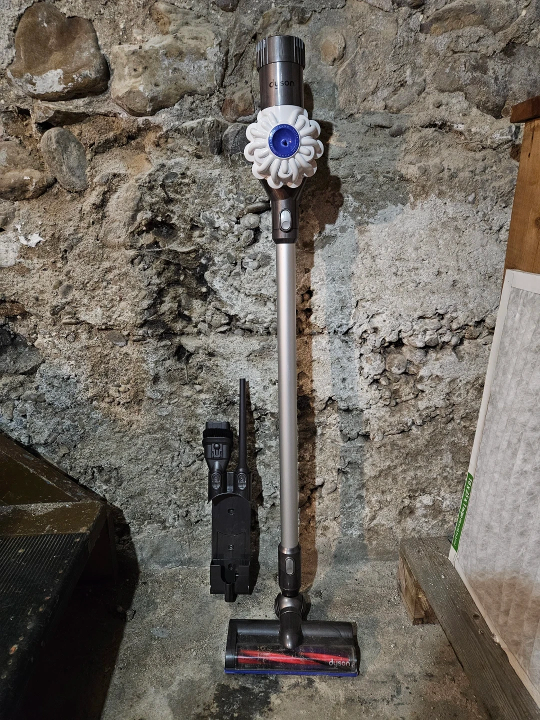 This is a Dyson cordless vacuum. It comes with a wall-mounting charging dock. The vacuum has a powerful suction for efficient cleaning and 2 attachments. Works but needs a new battery.
