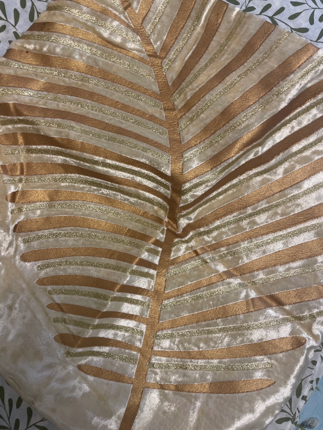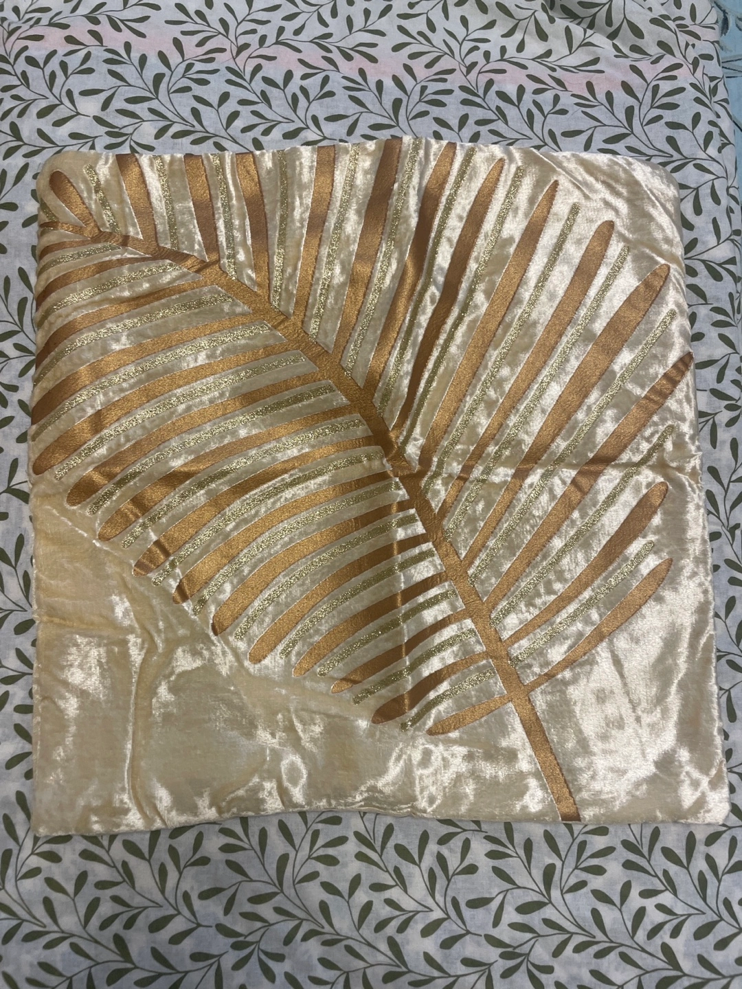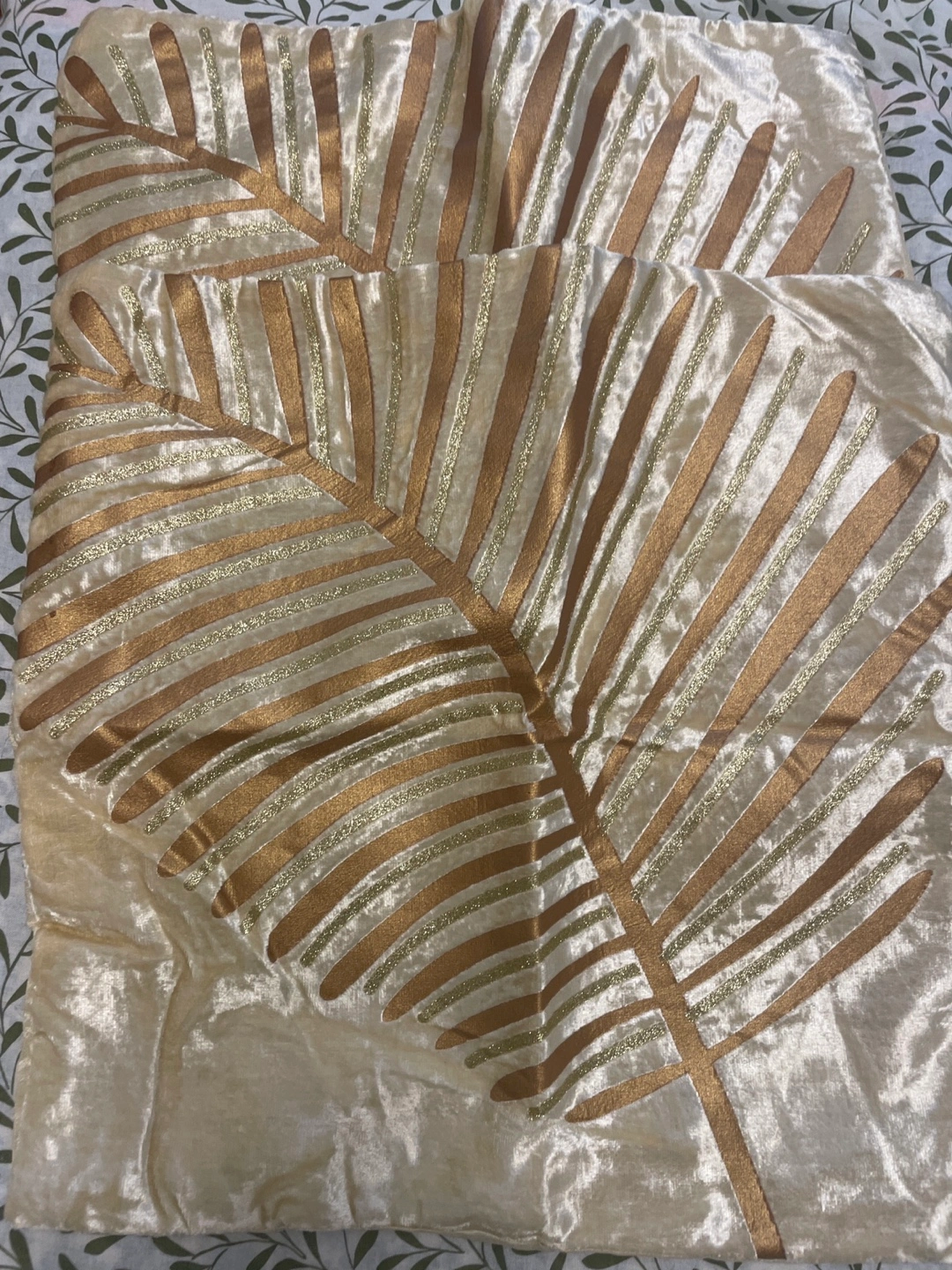 This is a decorative pillow cover with a leaf design. It’s a set of two. The colour is a creamy beige with gold accents. It's in great condition and would add a touch of elegance to any room