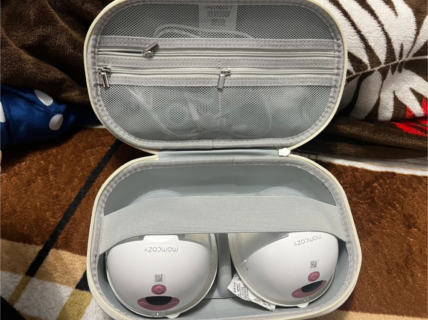 This is a Momcozy case for wearable breast pumps. It has a durable exterior and a zippered mesh compartment for accessories. Includes a strap to secure the pumps inside.