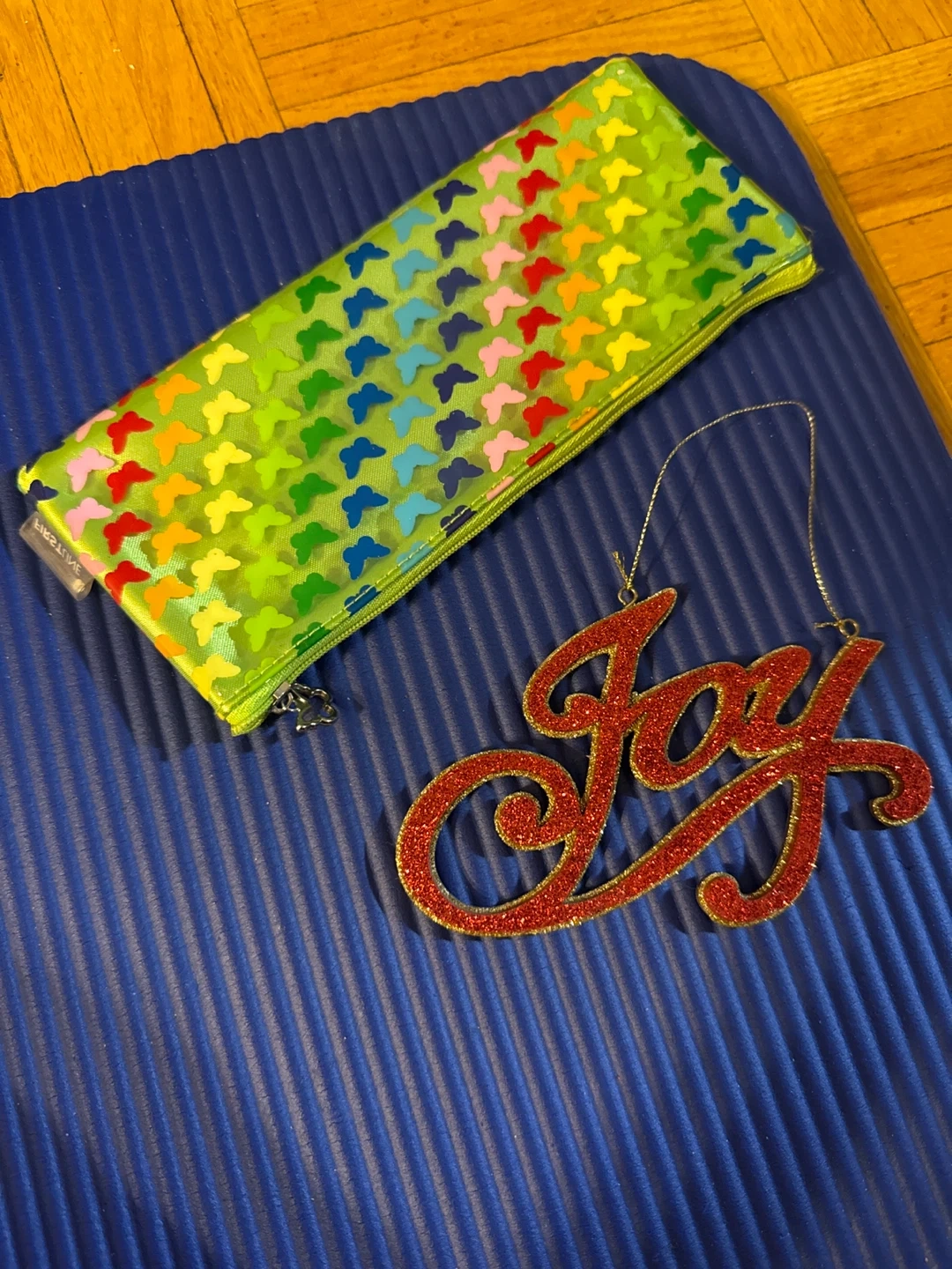 A bright green pencil case decorated with colourful butterflies. It's got a zip closure. Also giving away a sparkly red "Joy" ornament 😊