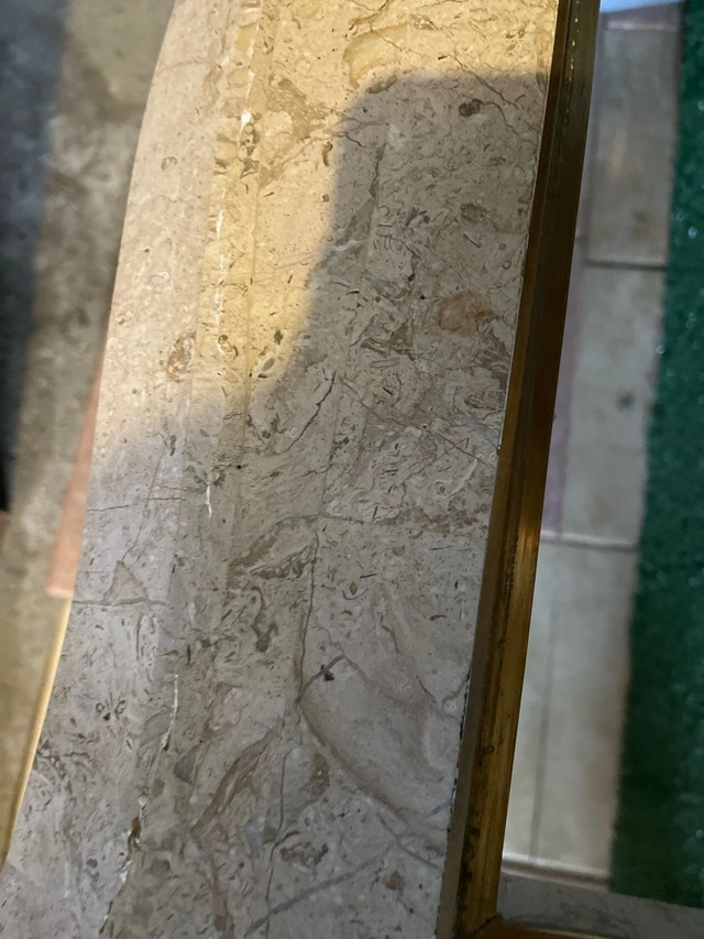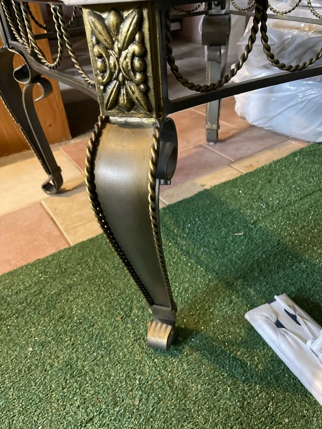 Add a touch of elegance to your living space with this eye-catching coffee table. This stylish table is in used condition, featuring a sturdy construction and a sophisticated design. It has a marble-like top and ornate metal legs. Please note, it is missing the glass insert for the middle section.