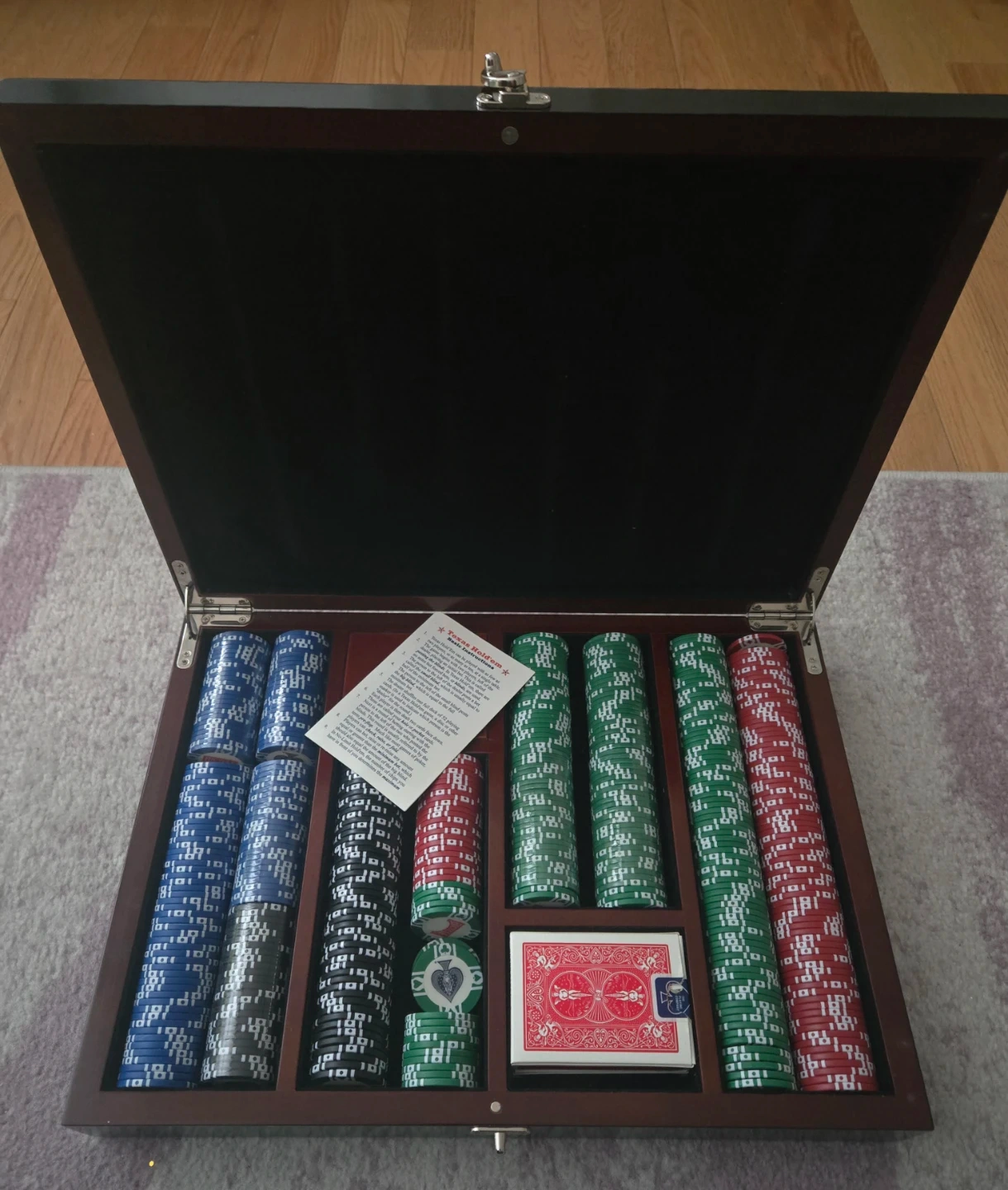 Selling a 500pcs Bicycle Texas Hold'em poker set, complete with a stylish case. It includes everything you need for a great poker night with friends and family. The set comes with poker chips and 2 packs of playing cards, all neatly organized in the included box!