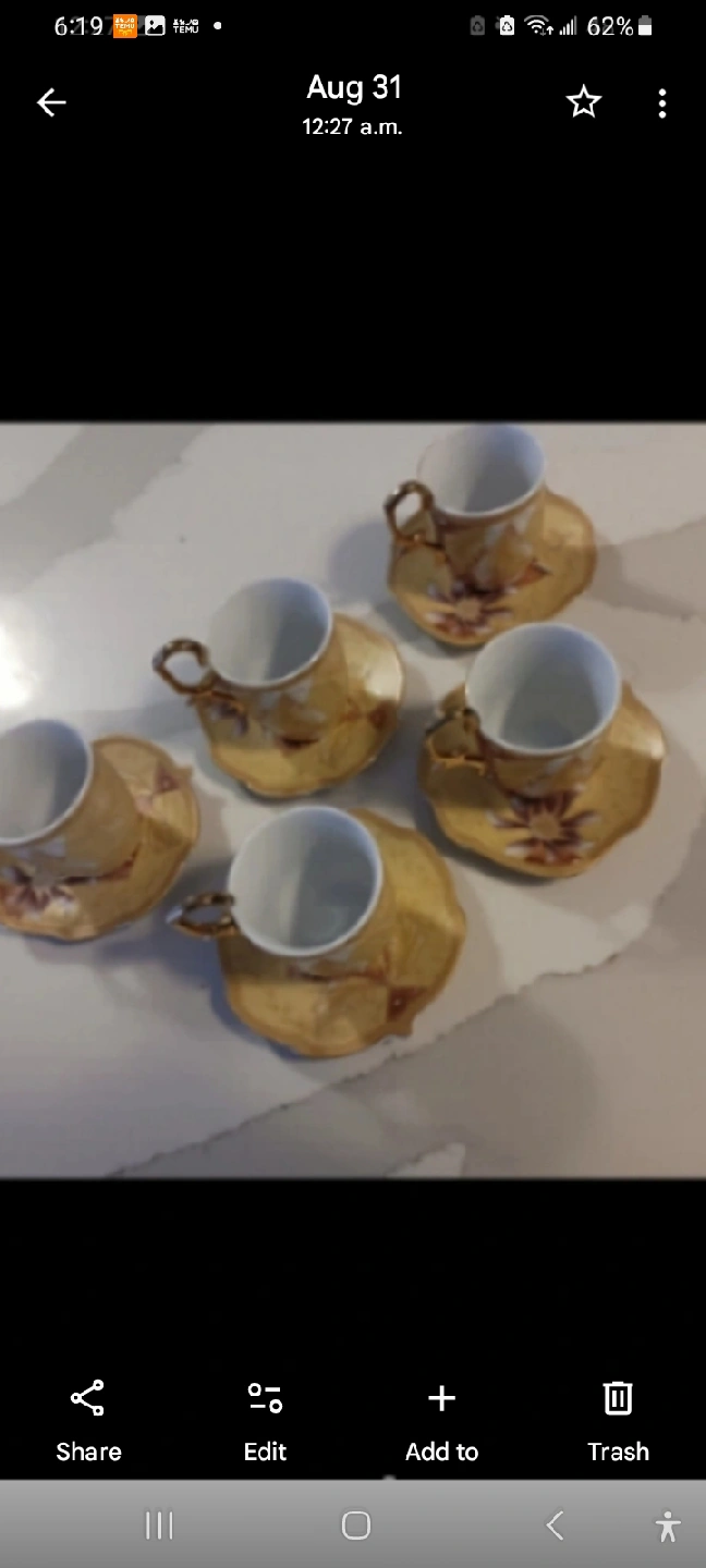 Selling a set of vintage tea cups and saucers. They have a unique design and would be a lovely addition to any collection or for enjoying a nice cup of tea!