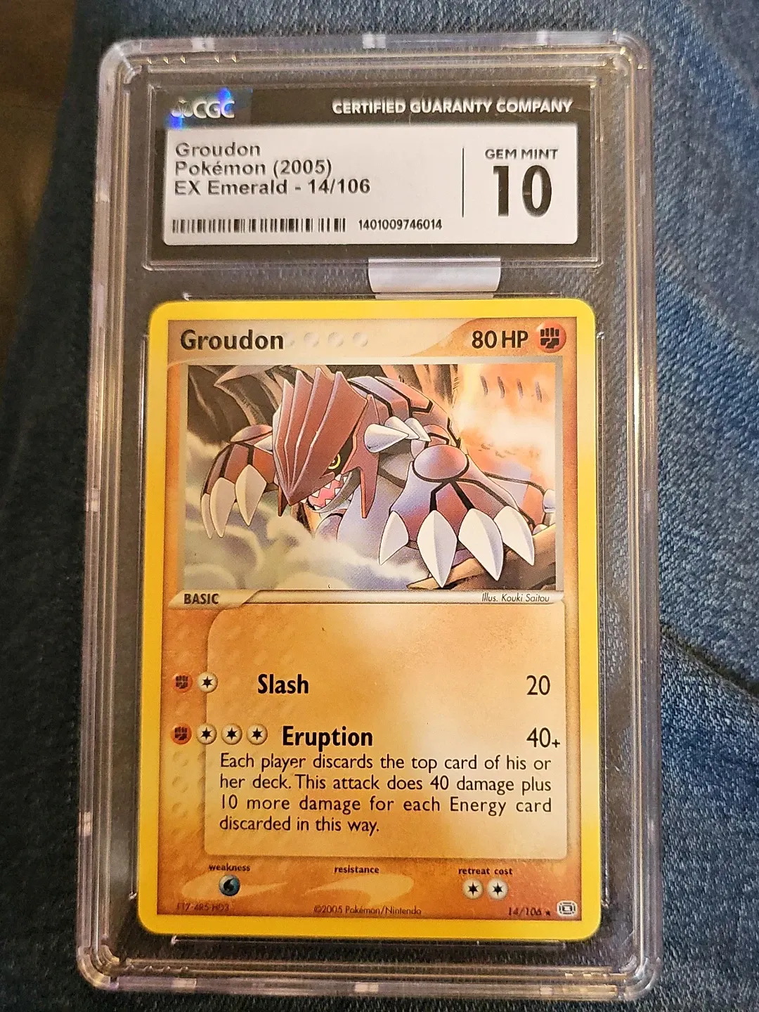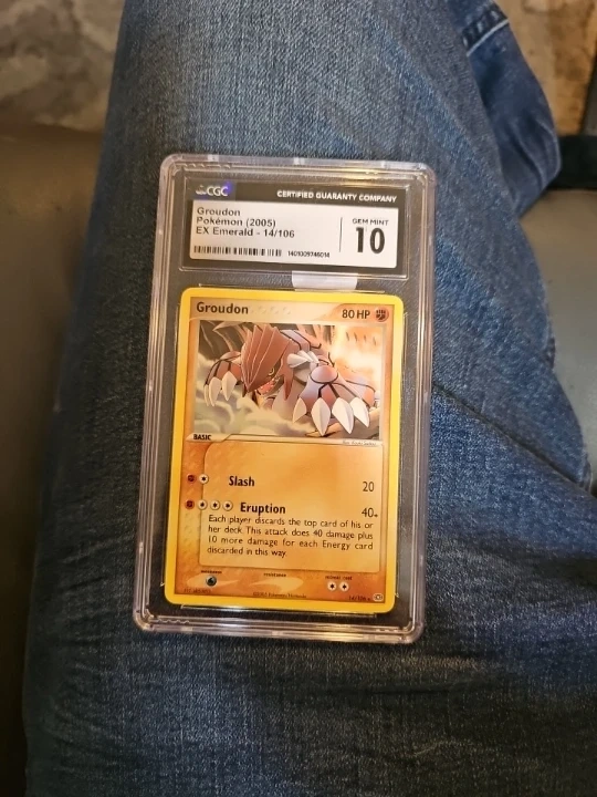 Buy & SellCGC Graded Groudon GEM MINT 10CGC Graded Groudon GEM MINT 10$35Graded Groudon Pokémon card from the 2005 EX Emerald set. It's graded GEM MINT 10 by CGC. Features the card number 14/106.ConditionNewWHERE TO MEETCheck LocationView MapSELLERverifiedRolandSharon HI650 reviews0 chats·0 favorites·3 viewsSEND CHAT TO SELLERHi Roland! I’m interested in your listing.Hi Roland! I’m interested in your listing.Get the Karrot app to chatSign In to chat