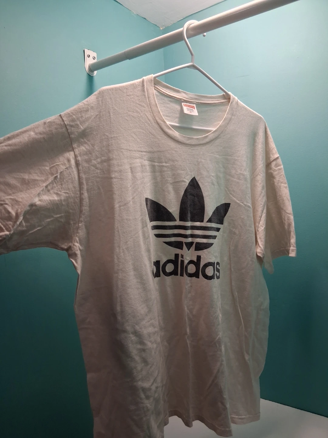 This is a Supreme t-shirt with the classic Adidas trefoil logo. It's made of 100% pre-shrunk cotton. Made in USA.