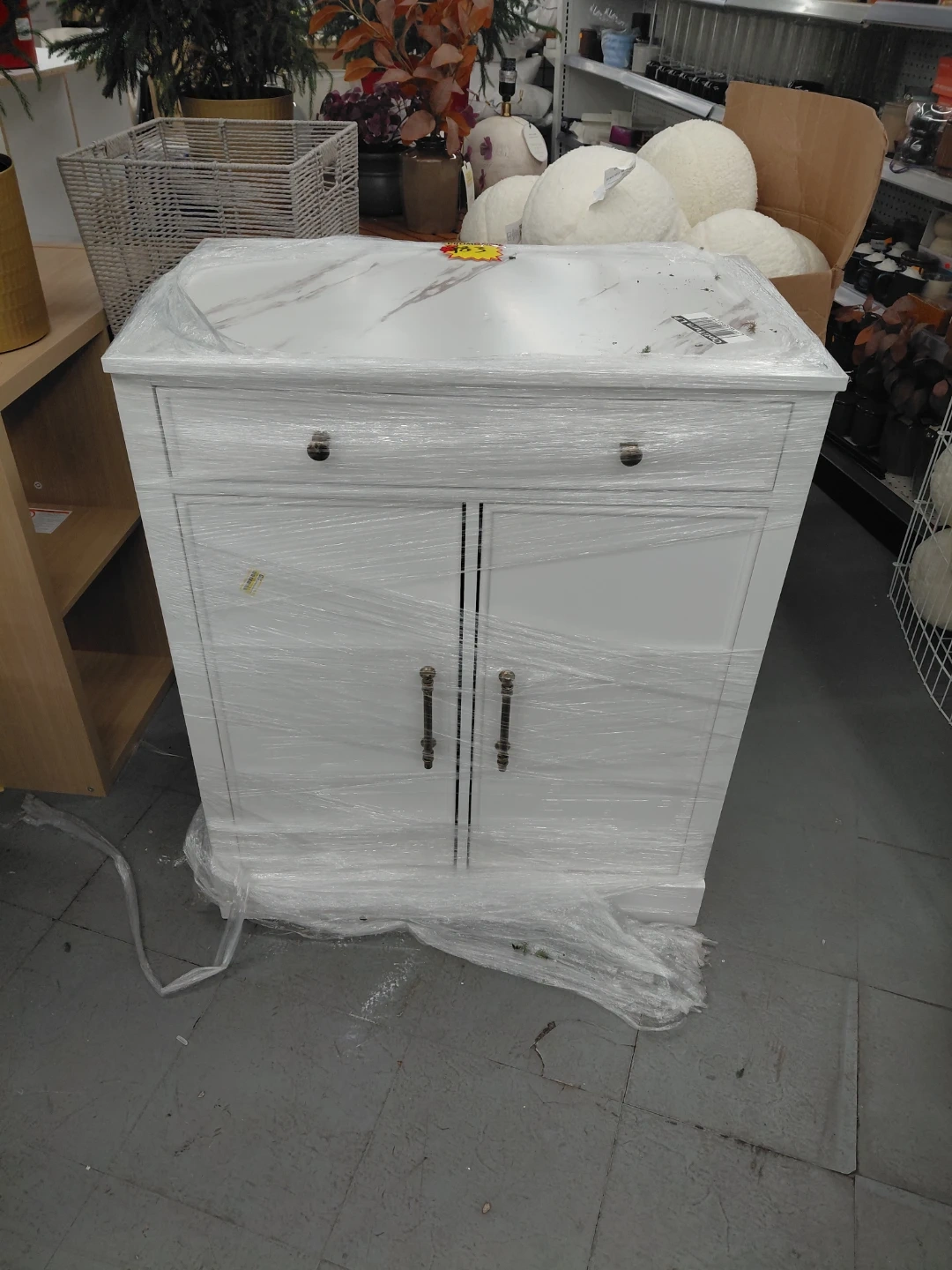 Selling a brand new white vanity cabinet with a faux marble top. It's still in its original packaging, ensuring it's in perfect condition. This cabinet would be a great addition to any bathroom or small space needing extra storage