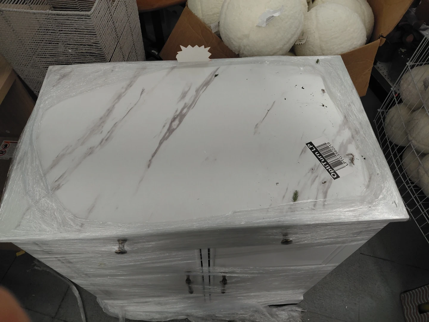 Selling a brand new white vanity cabinet with a faux marble top. It's still in its original packaging, ensuring it's in perfect condition. This cabinet would be a great addition to any bathroom or small space needing extra storage
