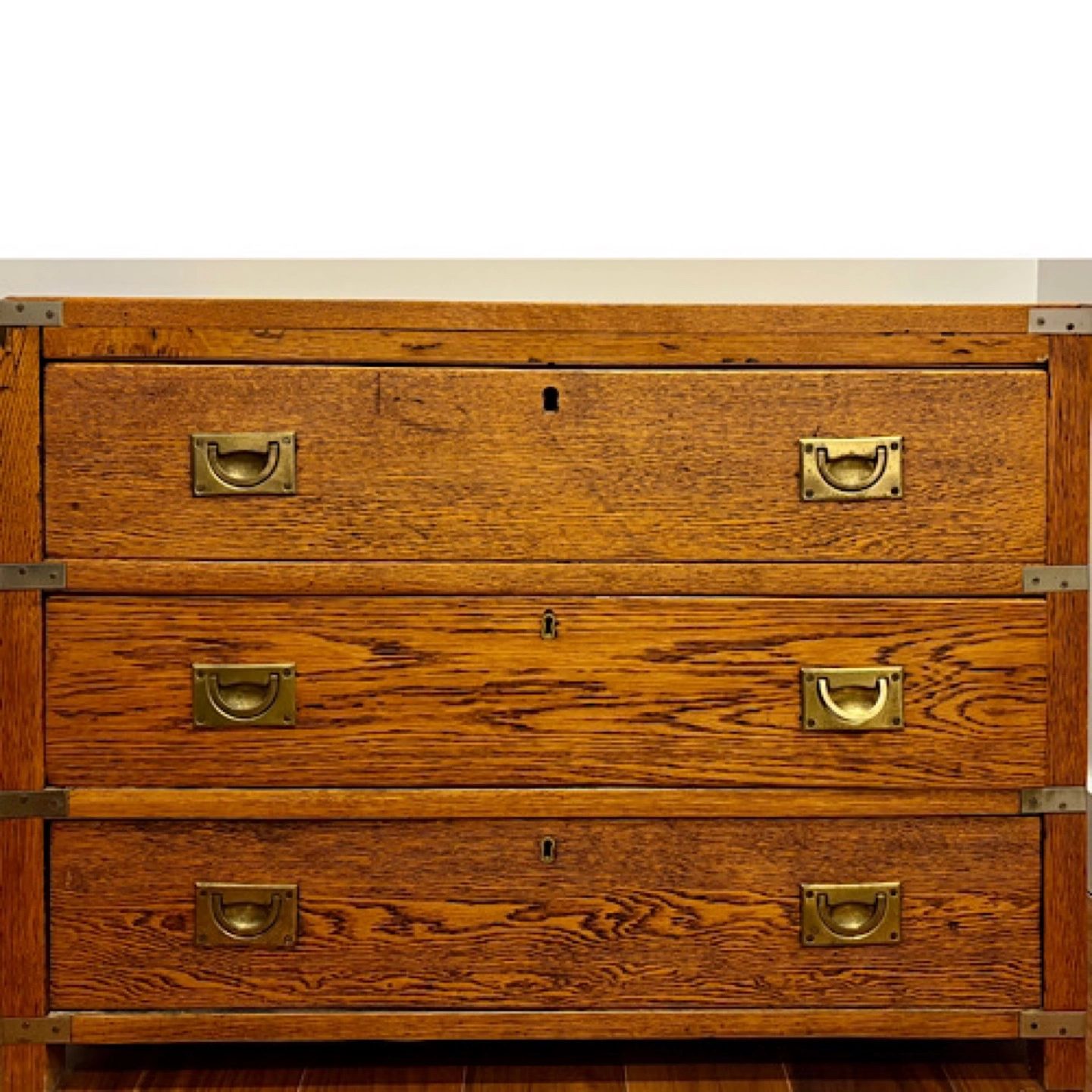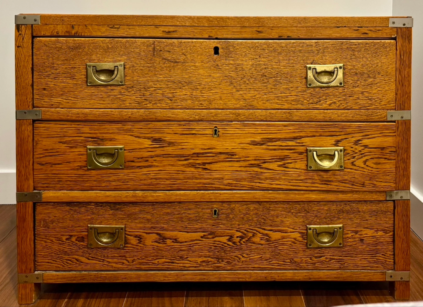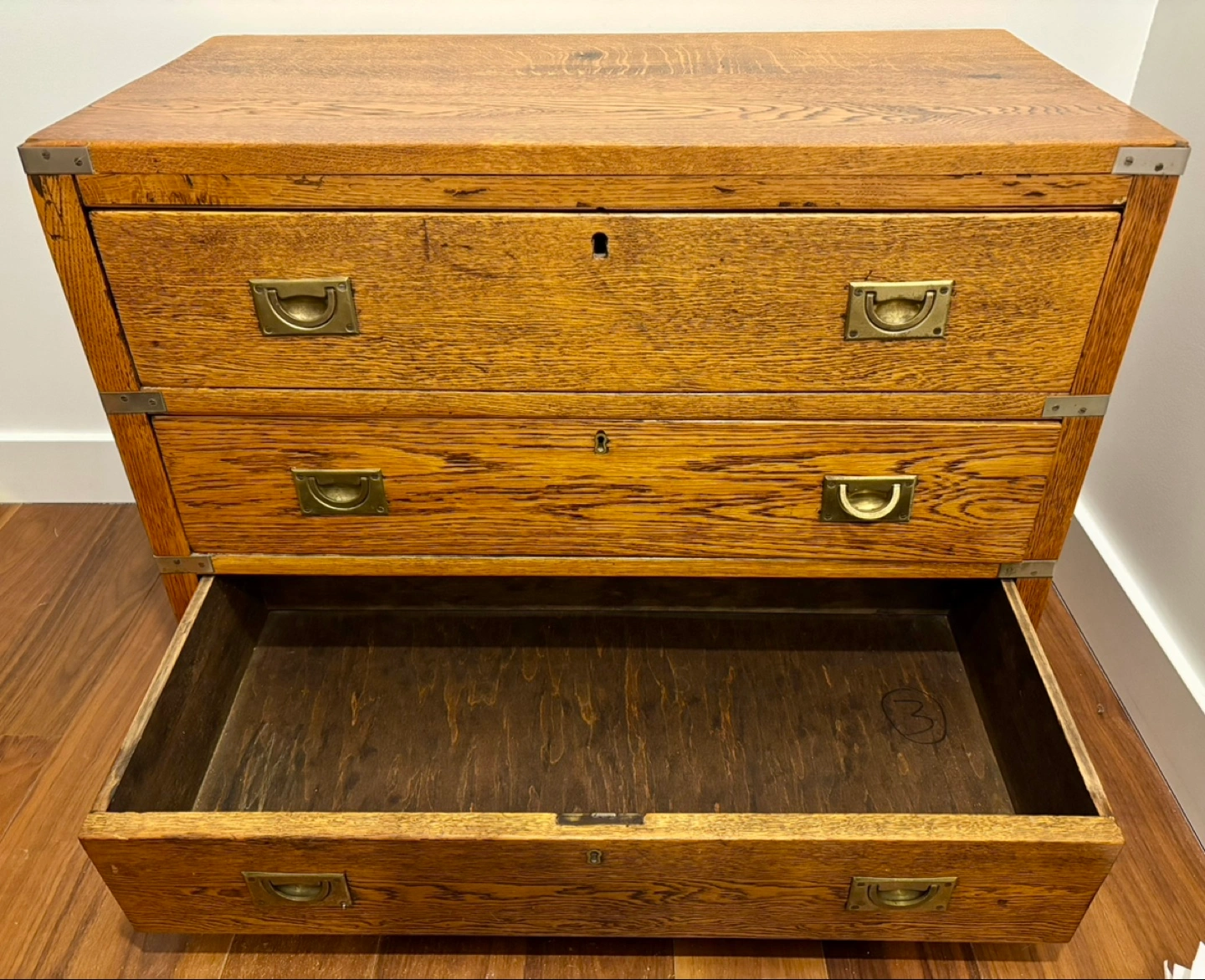 Three-drawer campaign chest. Solid wood construction. Brass hardware. Shows some age and wear.