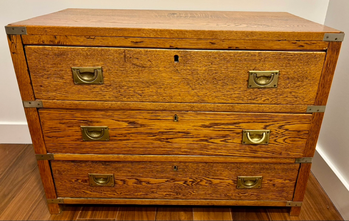 Three-drawer campaign chest. Solid wood construction. Brass hardware. Shows some age and wear.