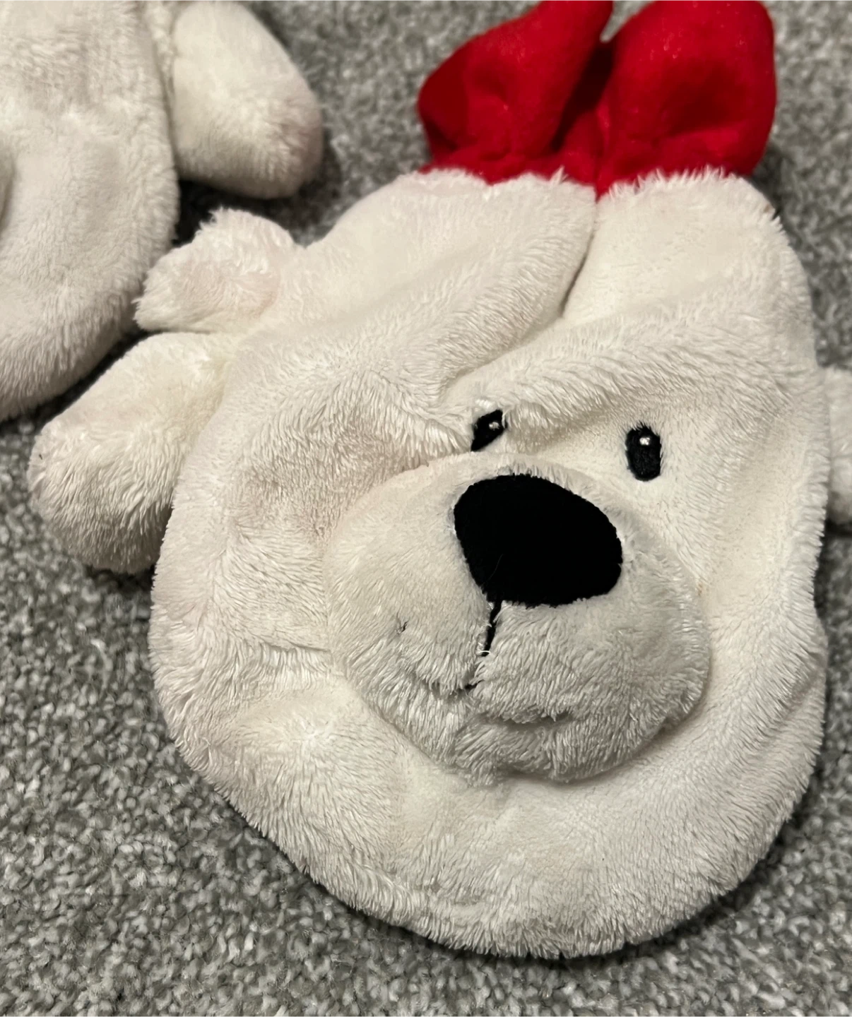 Cute white polar bear mittens with red festive cuffs. Made by Gund Kids, these mittens are designed for little ones. Soft plush material for warmth.