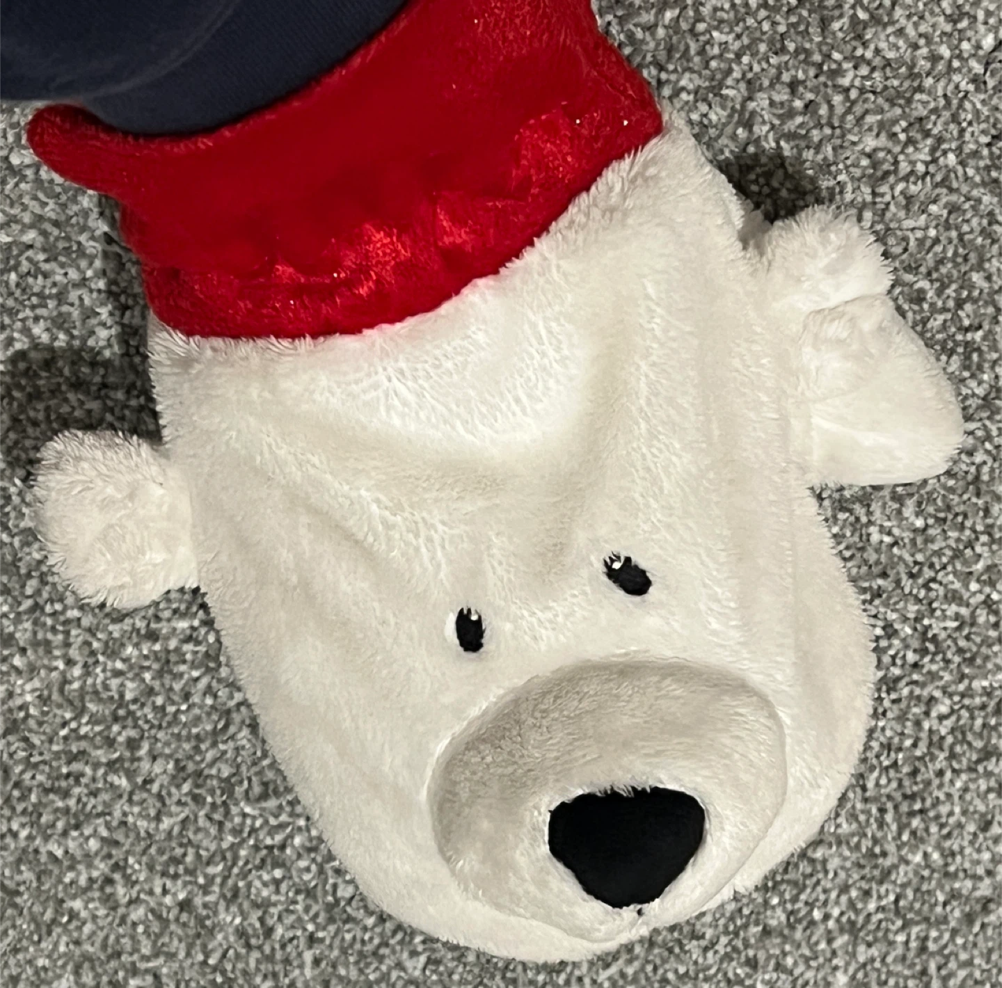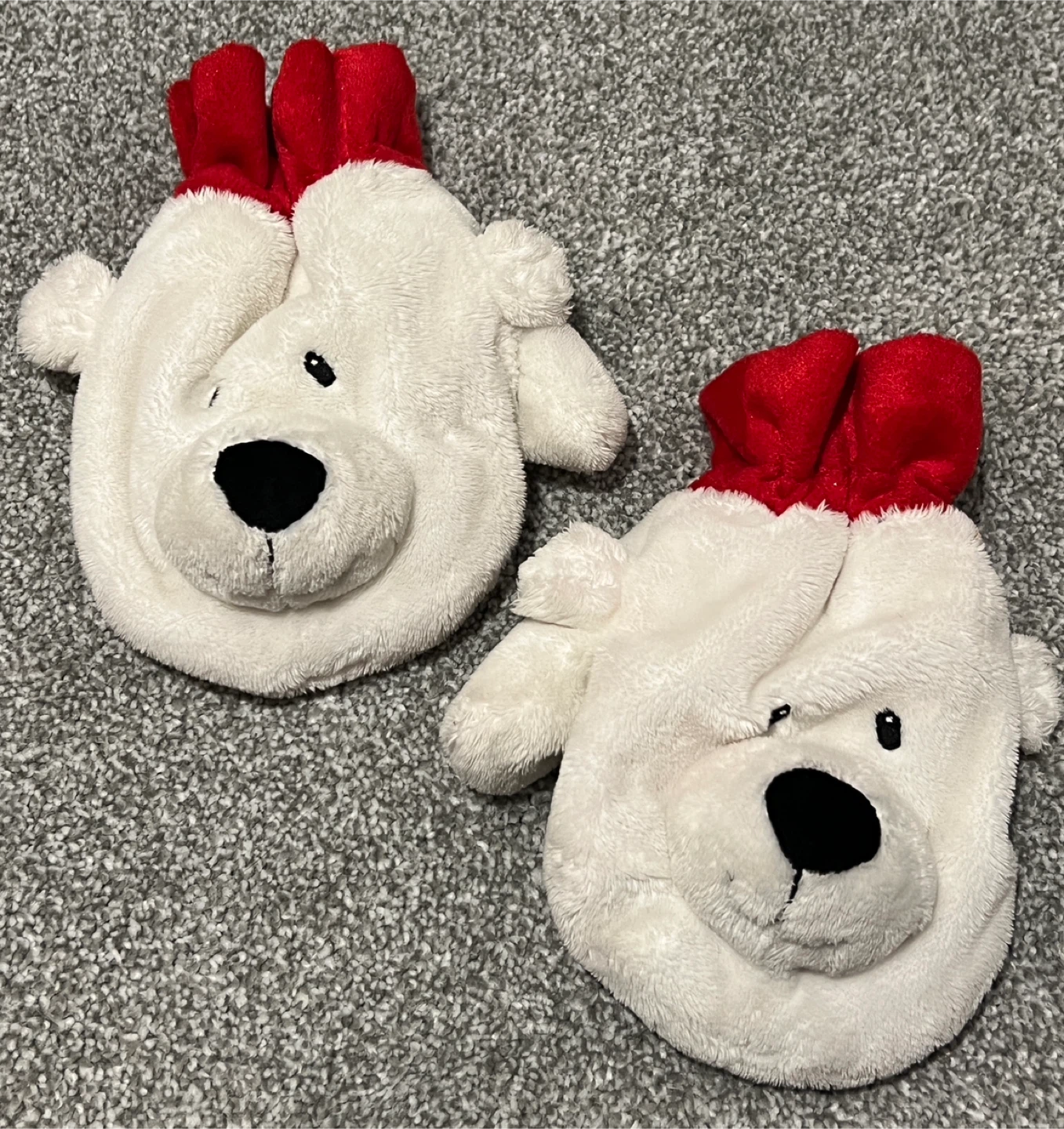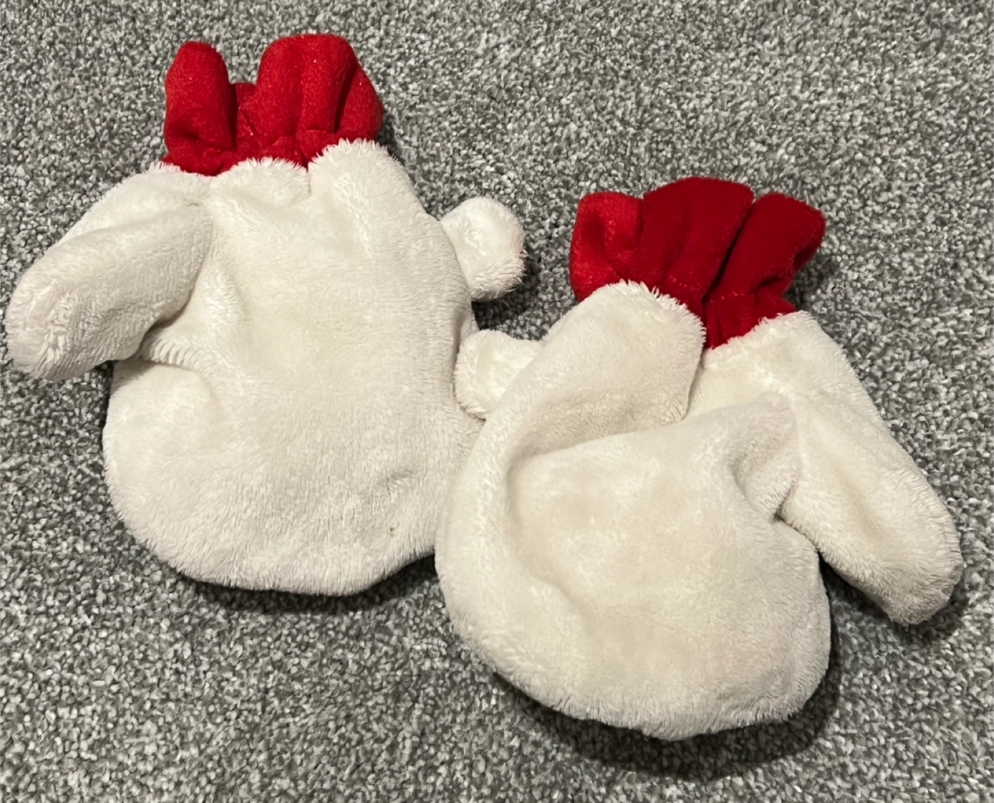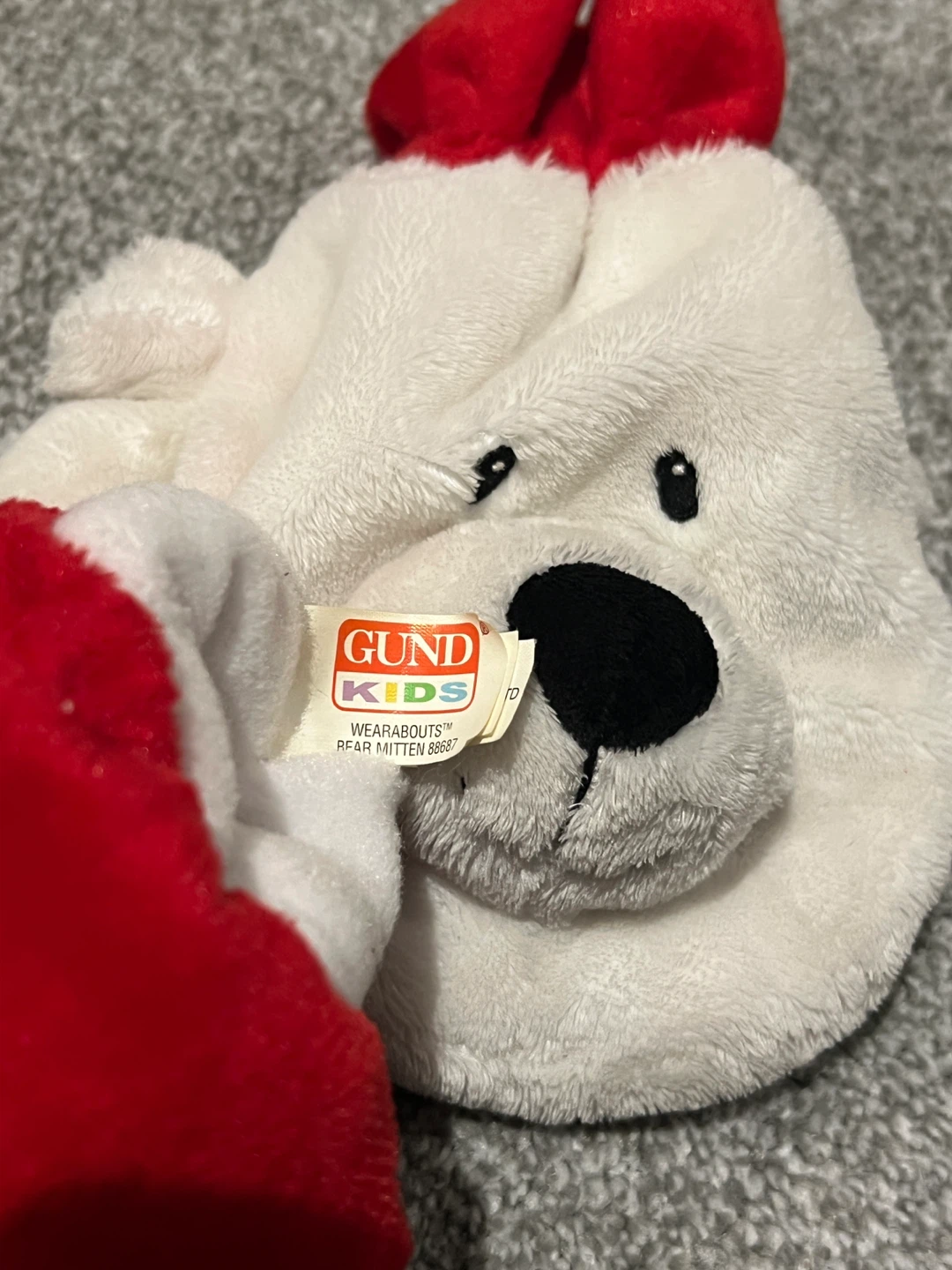 Cute white polar bear mittens with red festive cuffs. Made by Gund Kids, these mittens are designed for little ones. Soft plush material for warmth.