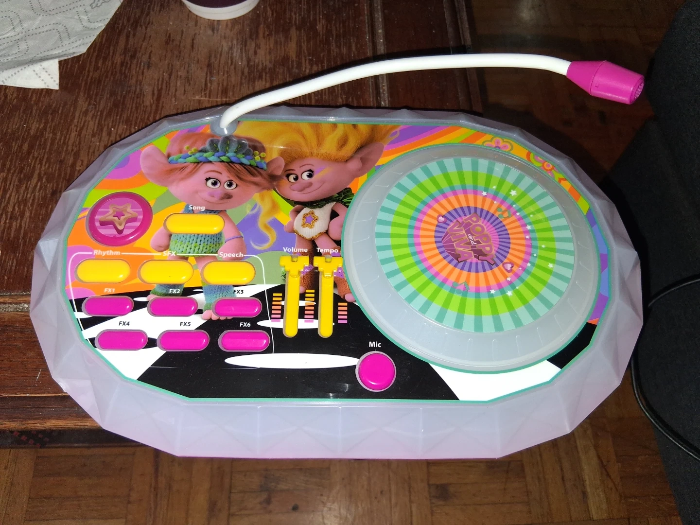 This fun Trolls-themed toy lets kids create music with different rhythm and speech effects. It includes a microphone and various buttons for sound control. It's perfect for little ones who love to sing and play!