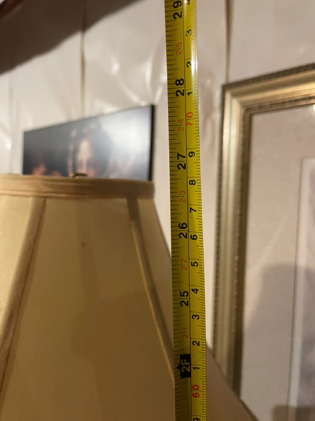A table lamp with a beige shade and a dark base. The lamp's shade measures approximately 27 inches in height. It's a great accent piece for any room!