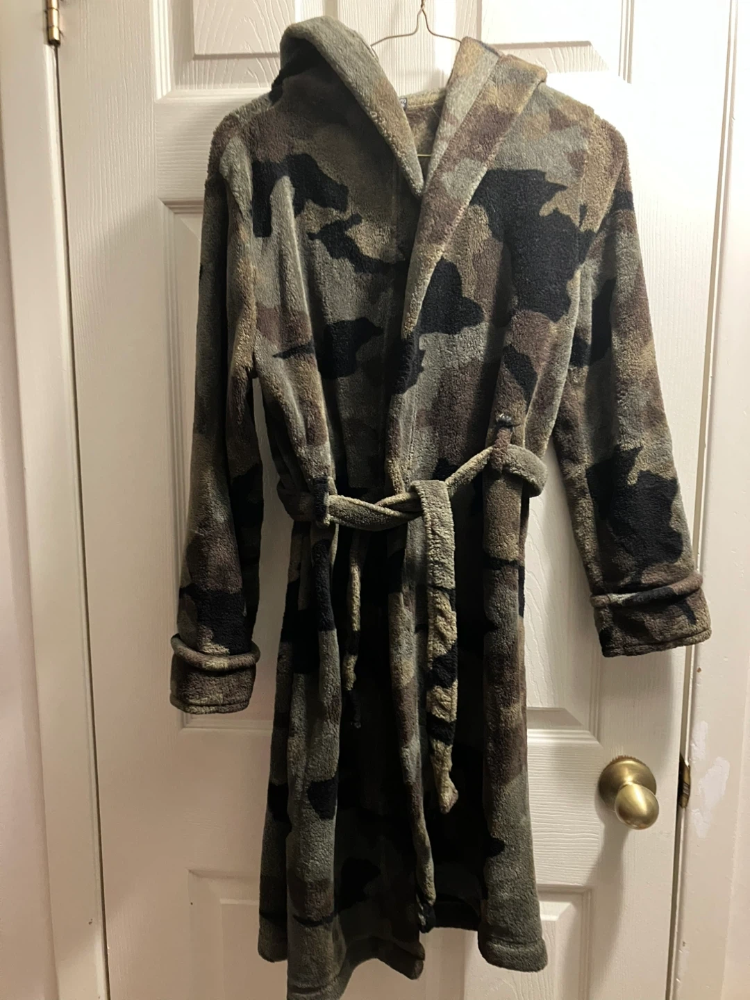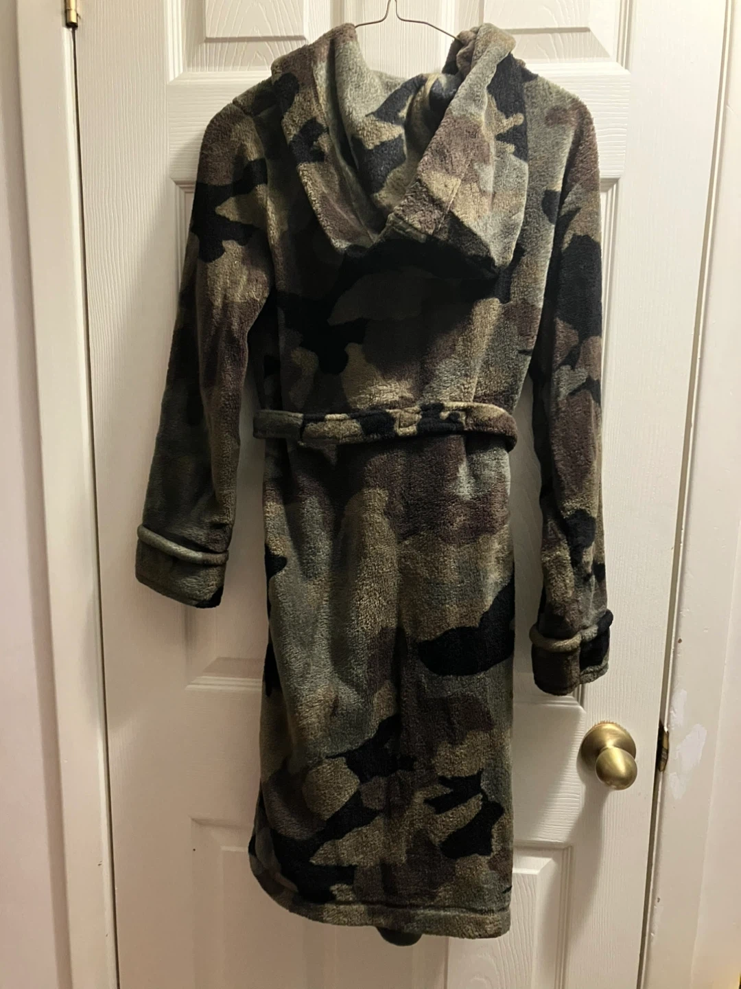 Kids size xl 16 Cozy camouflage hooded robe. It's made from soft fleece material and includes a tie belt for a snug fit. Perfect for lounging around the house!