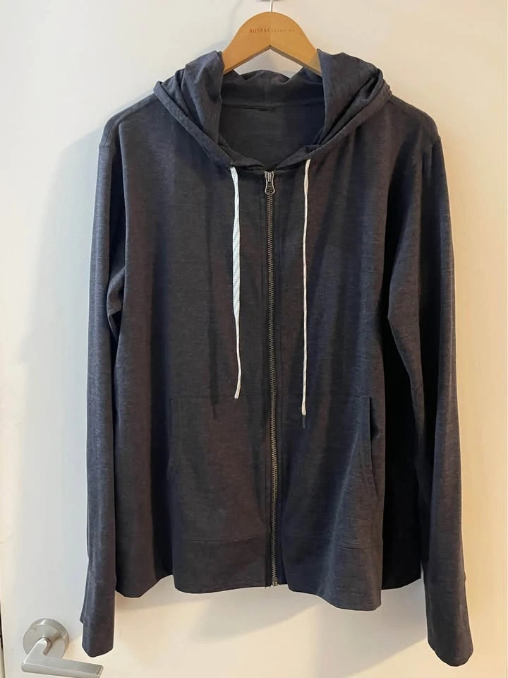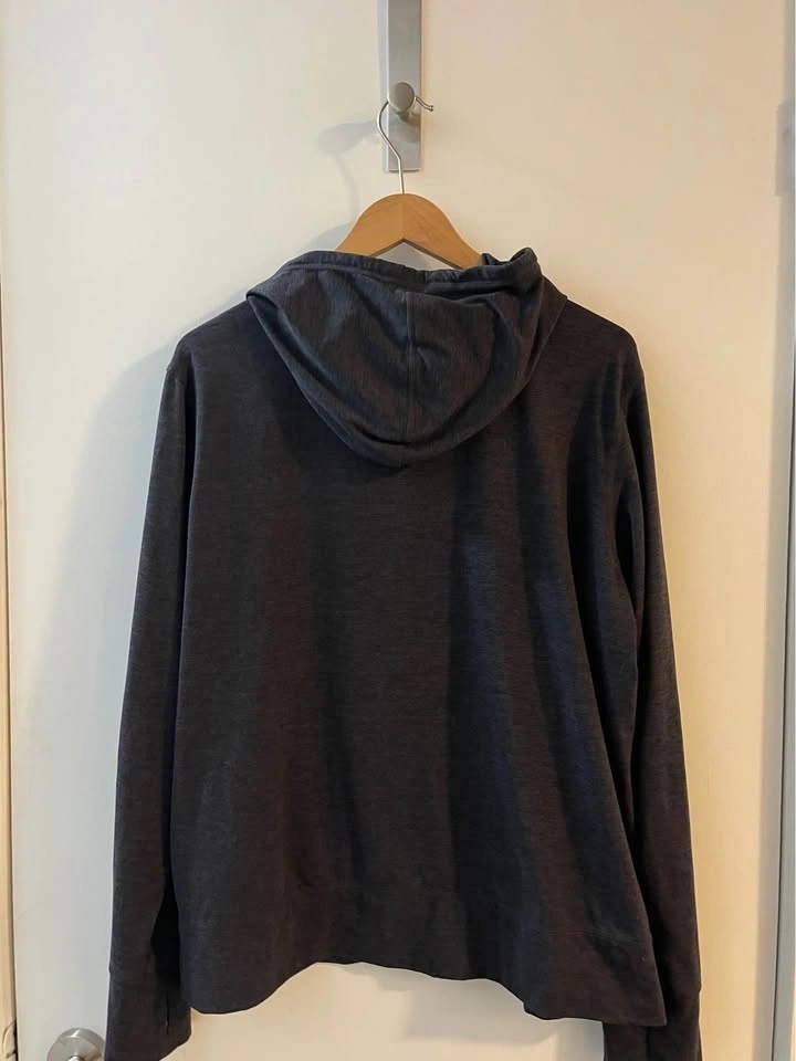 Kirkland Signature women’s lightweight full zip hoodie. Size Large, charcoal grey. Condition: like new. Worn once and laundered/stored. I did remove the tags because they irritate me. Features: Moisture wicking fabric, Front pockets, Adjustable drawcord, Machine washable. Colour: black, dark red or pink. Made in Lesotho. Fabric Content: 89% recycled polyester, 11% spandex. Size L: Front body length: 26 in. (66.04 cm), Chest circumference: 43.5 in. (110.49 cm), Sweep at hem: 44.5 in. (113.03 cm), Sleeve Length: 26.12 in. (66.35 cm).
