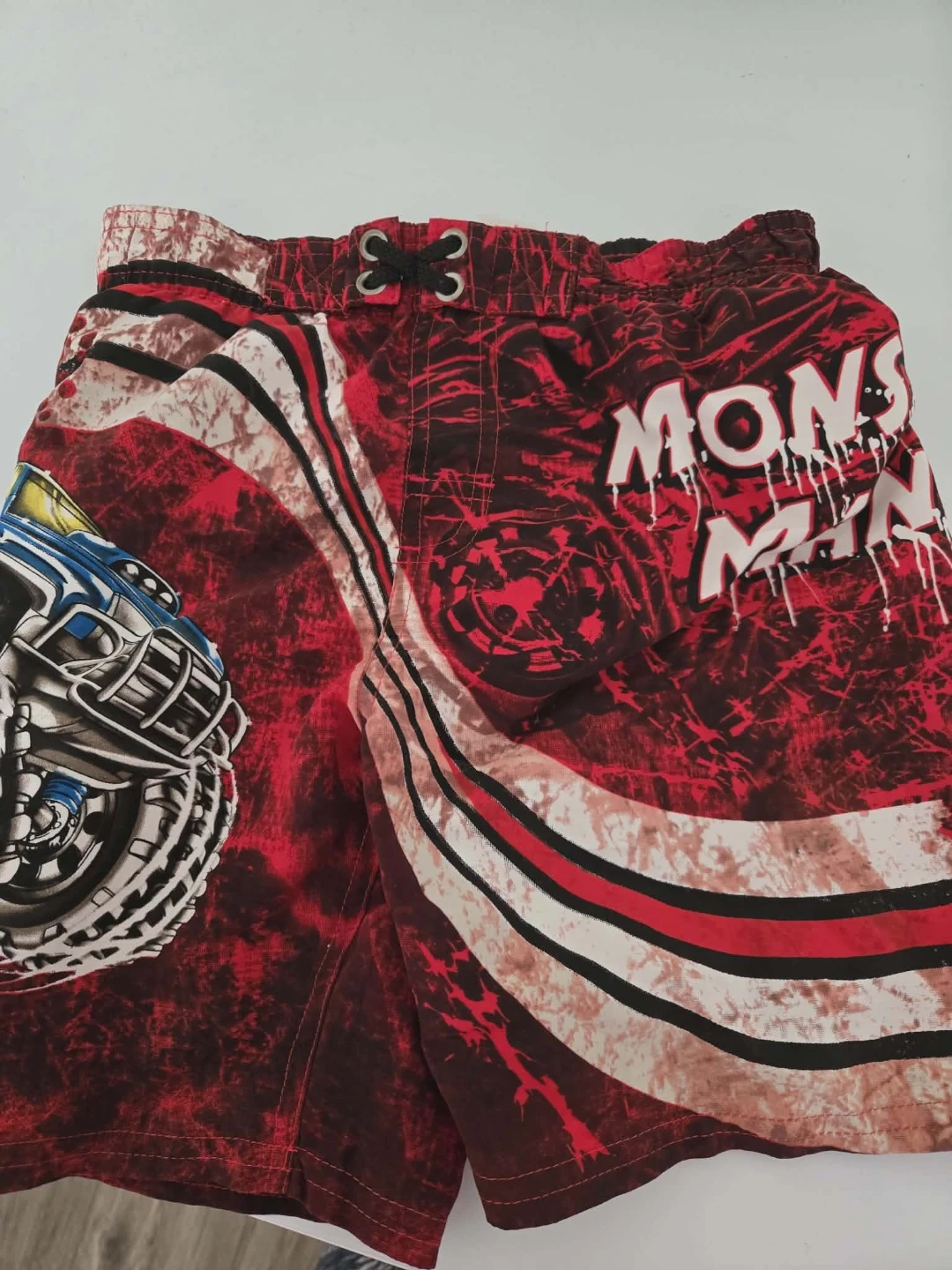 Red and black tie-dye swim trunks with Monster Jam graphics. Features a drawstring waist with grommets. Likely a youth size based on the design.