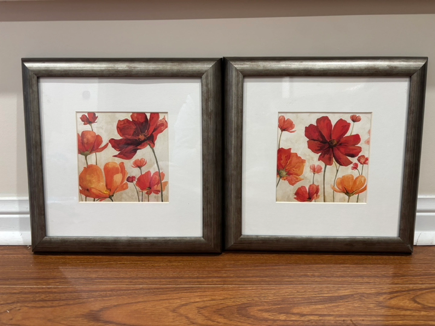 Set of two framed pictures. Features orange and red flowers. Dark silver frames. It goes with brown as well. Perfect for adding a touch of colour to your home.
