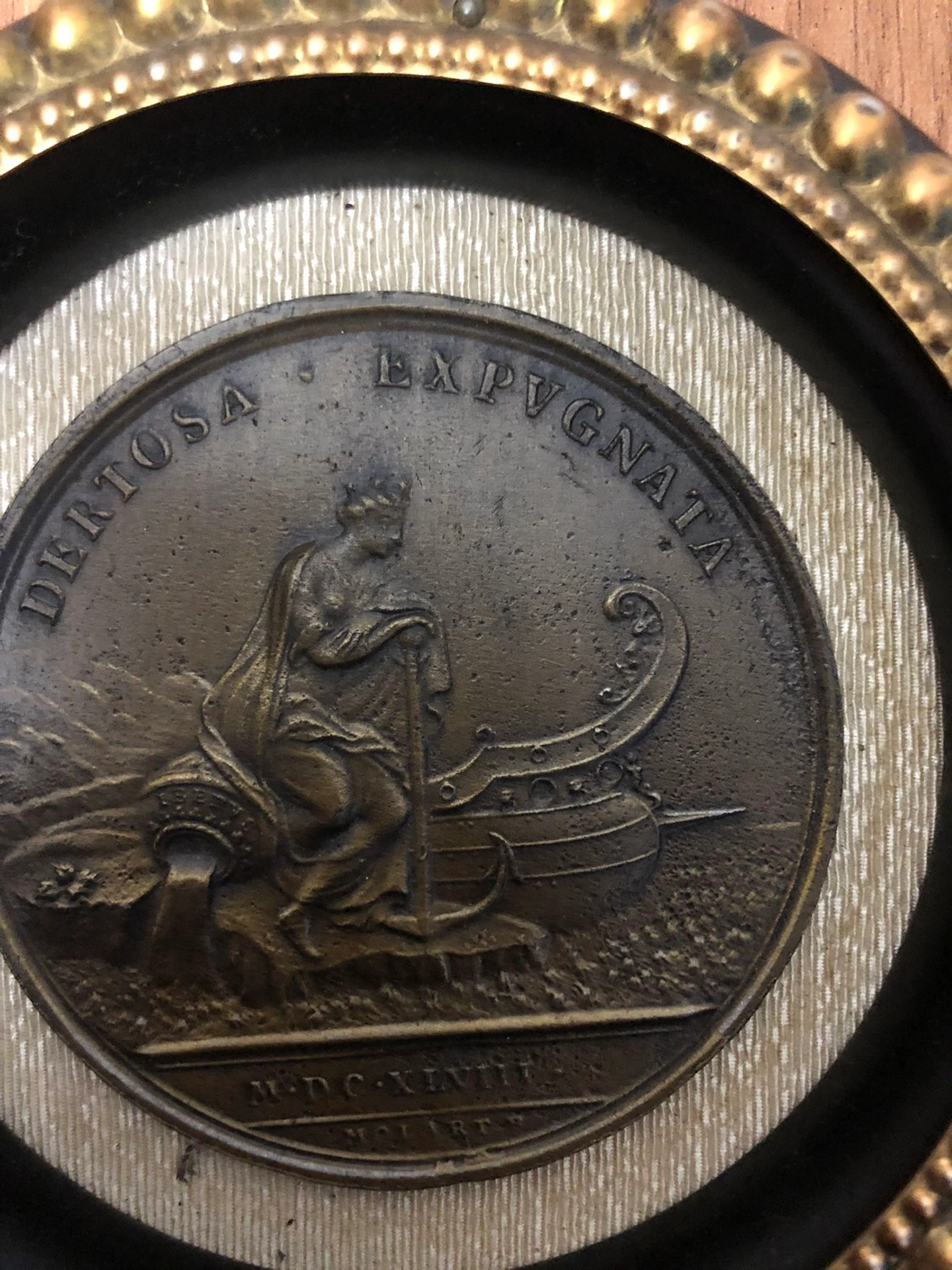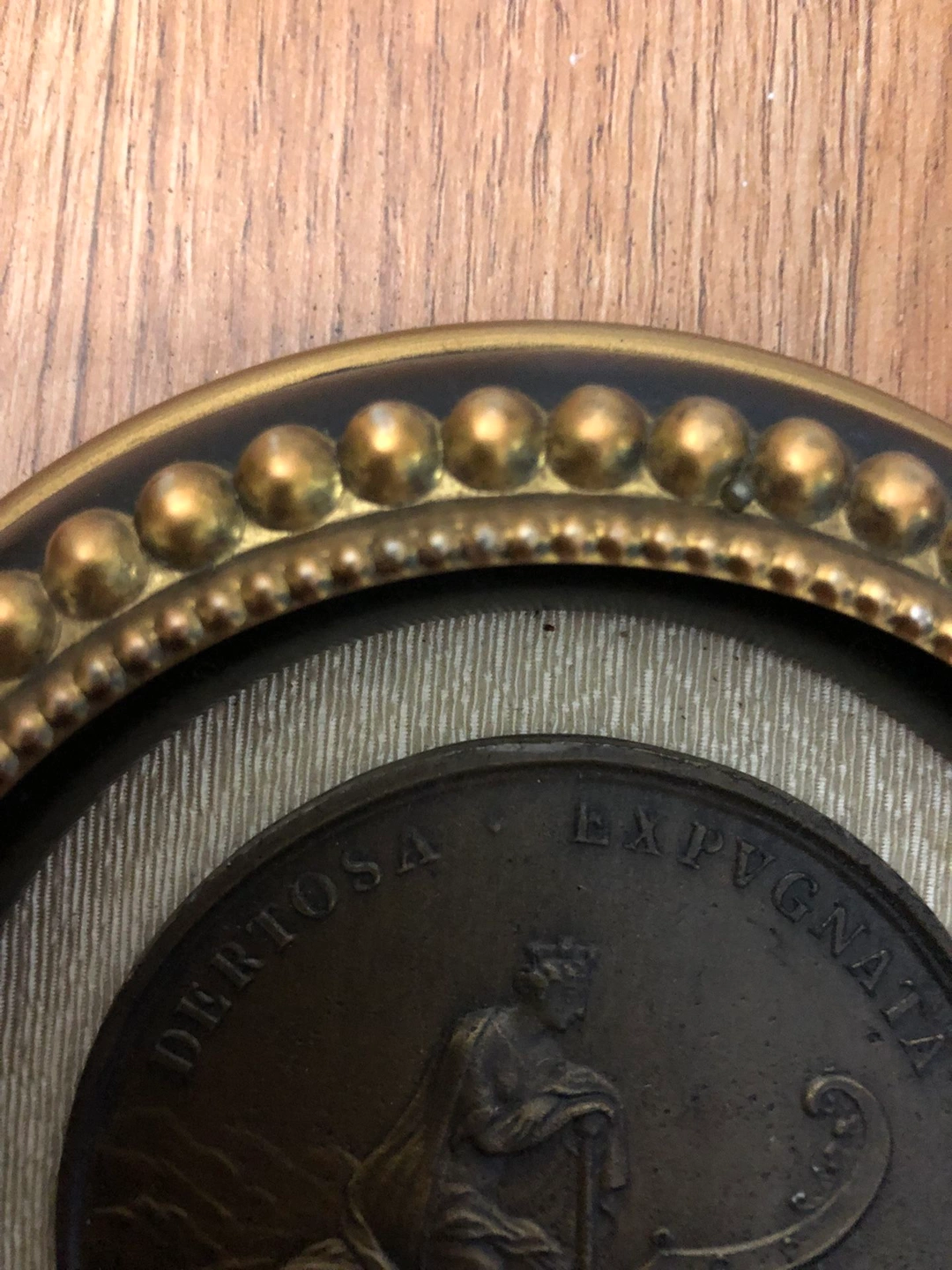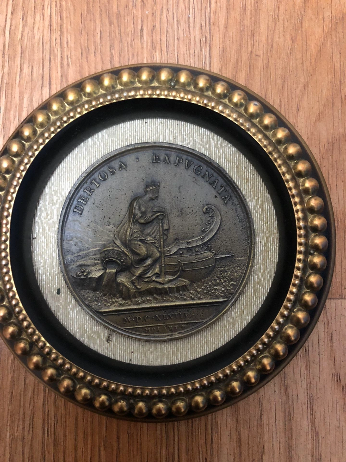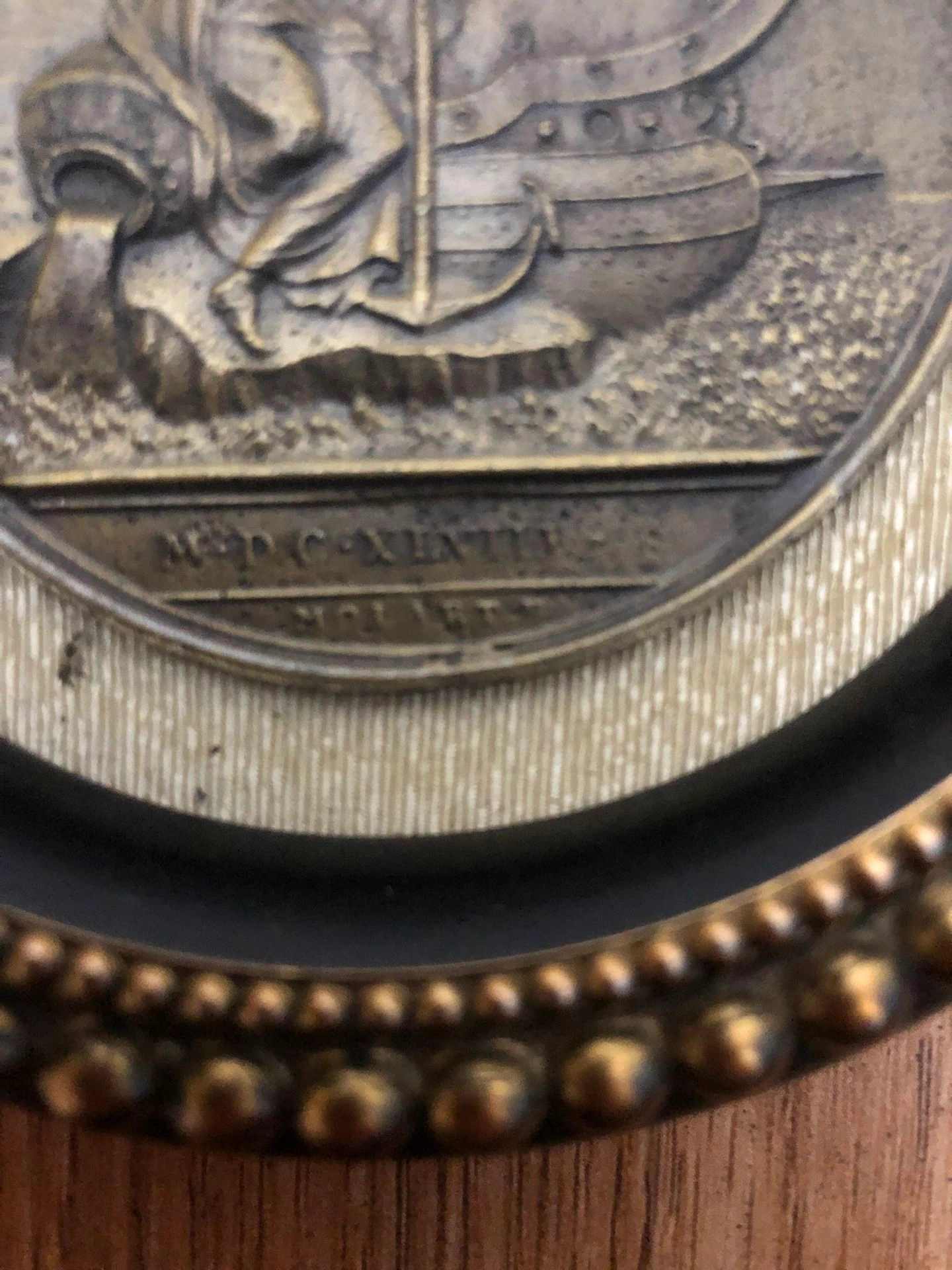 Antique Italian "Incolvmitas Pvblica" large bronze medal, 3" diameter, displayed in a 5" diameter wooden frame. Let me know if you're interested!