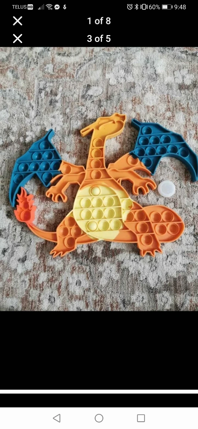 This Charizard-shaped Pop It fidget toy is a fun sensory tool. It's made of silicone and comes in orange, yellow, and blue. Great for anyone who enjoys tactile fidgets!